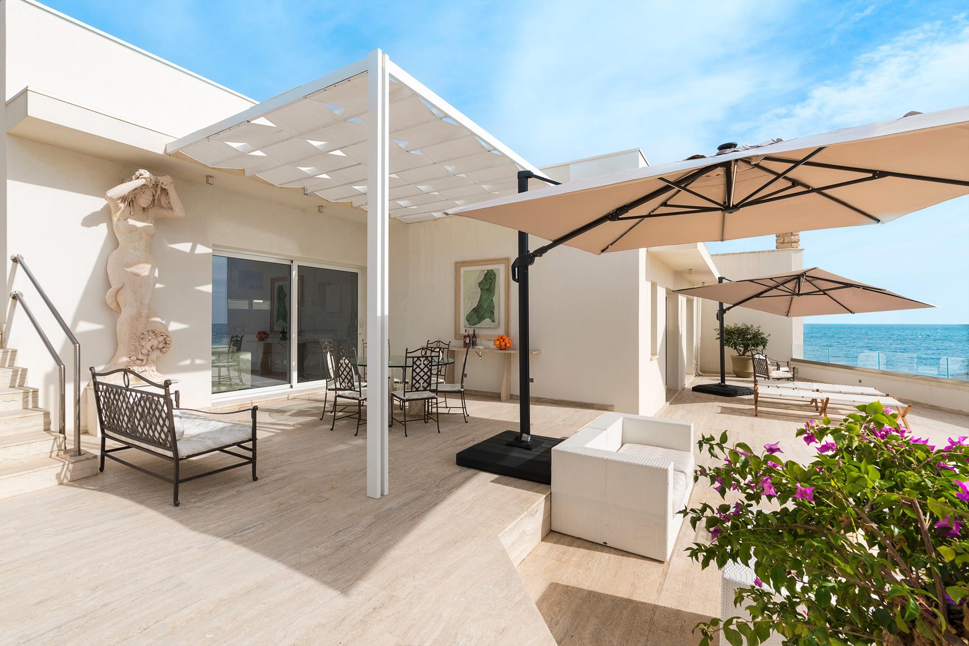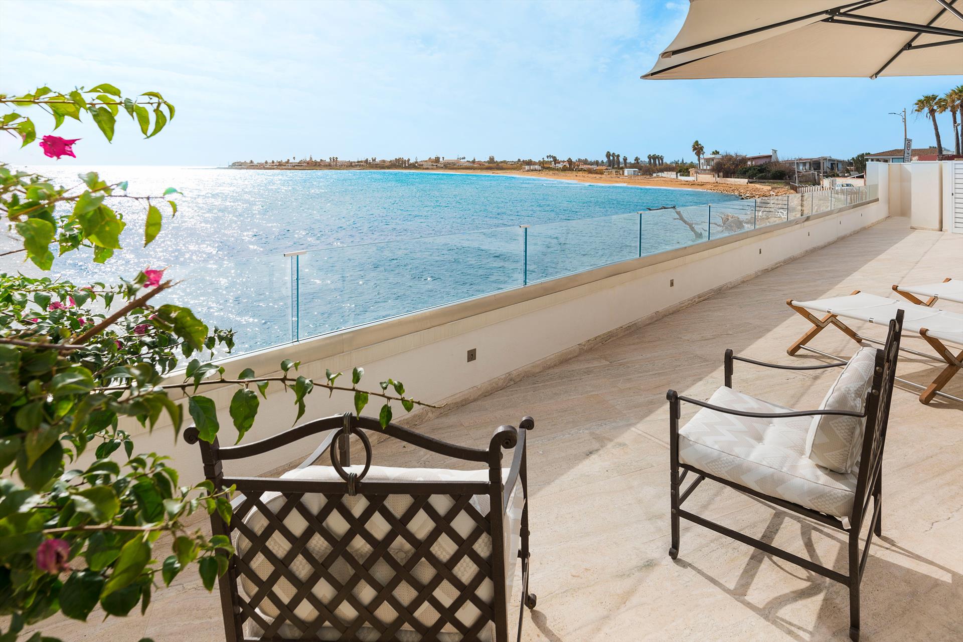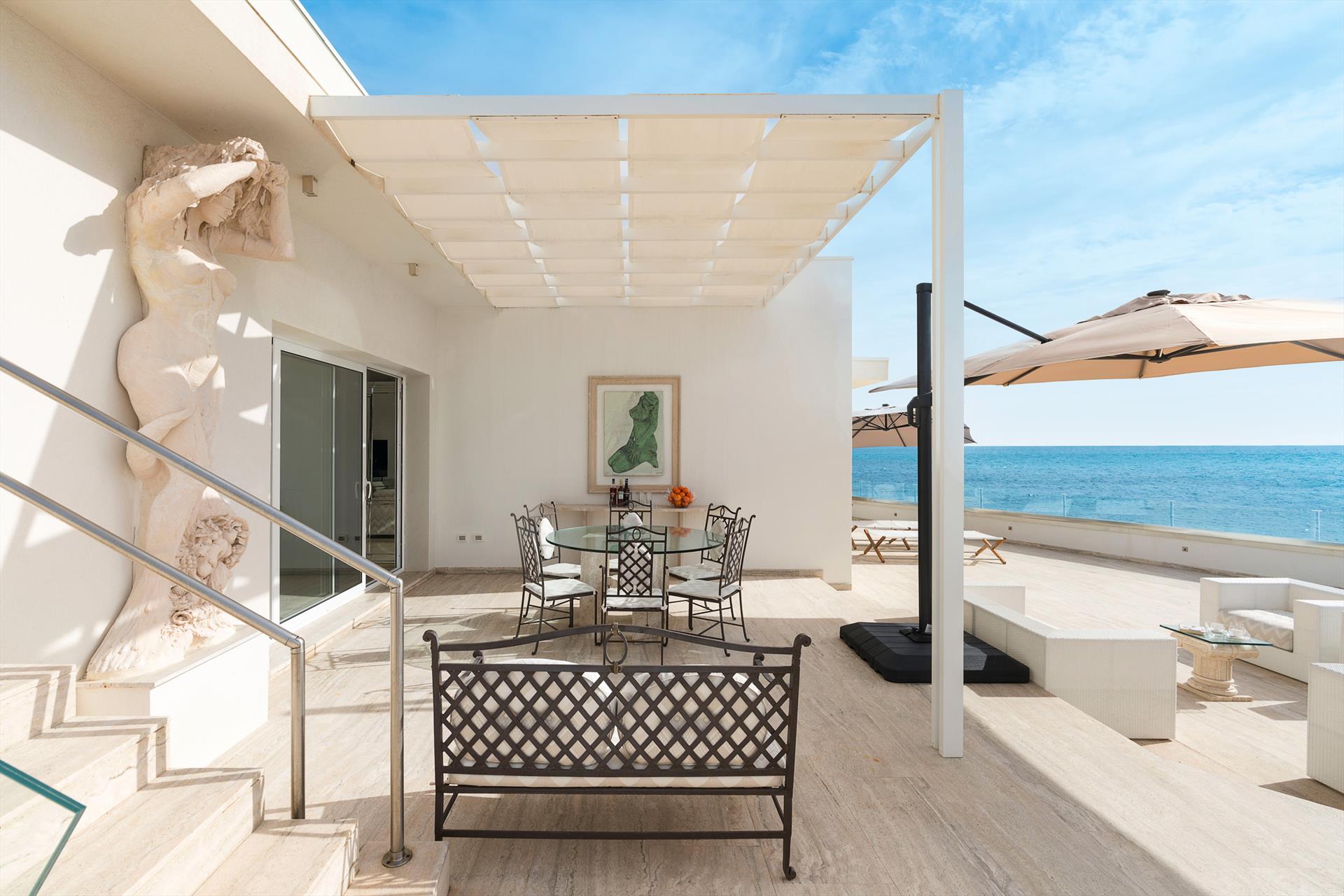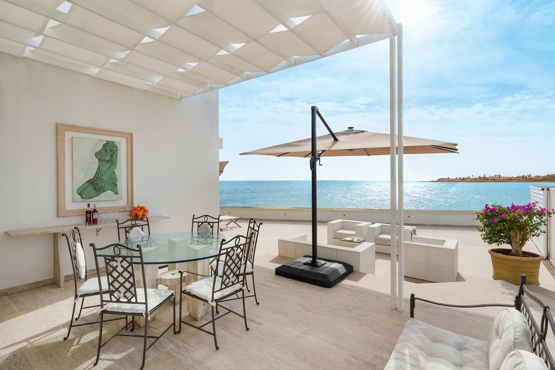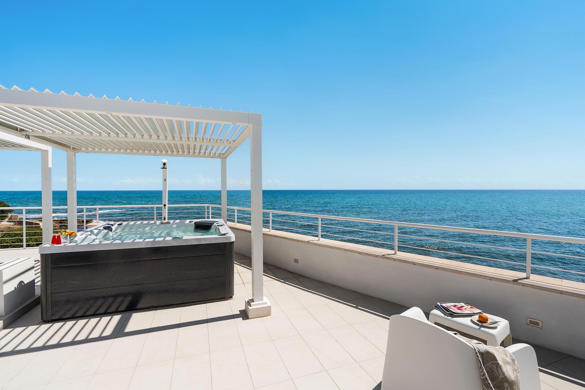 Exclusive seafront villa perched above the sea in Avola, in the surroundings of Syracuse. Villa Marea enjoys private access to the rocky shoreline and the sea, and is just over 100 metres from a beautiful sandy beach that can be easily reached on foot. The recently built villa features a solarium with a hot tub and a spacious terrace furnished with garden furniture, offering enchanting views over the Avola coastline. The welcoming and well-designed interiors include a bright open-plan living room and kitchen, two double bedrooms with en-suite bathrooms, a twin bedroom, and a third bathroom, also fitted with a shower. The villa is equipped with all modern comforts, including air conditioning and heating (in all rooms), Wi-Fi internet, two colour TVs, washing machine, dishwasher, barbecue and outdoor shower.