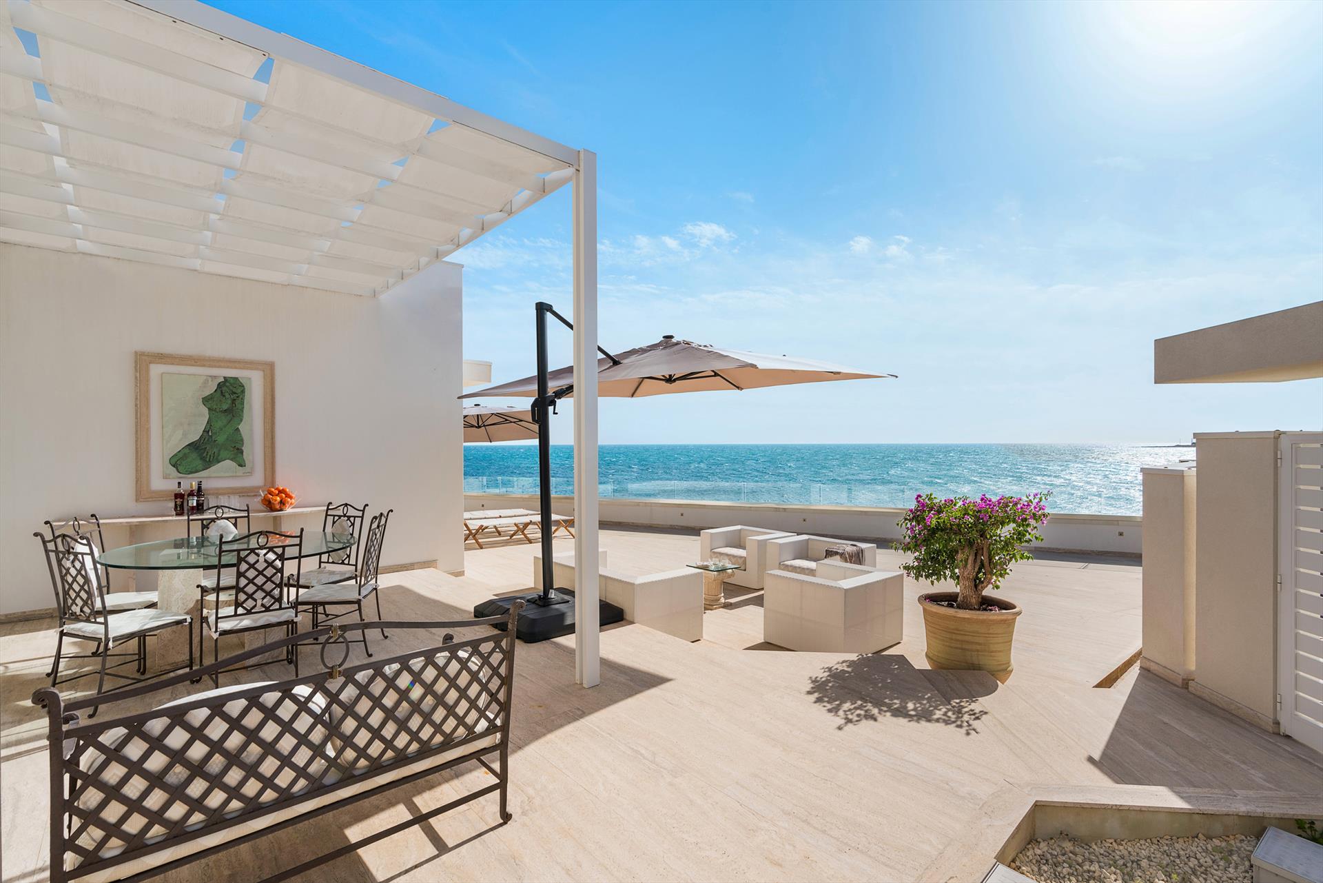 Terrace with pergola and solarium. First floor: solarium, bar area, and hot tub.