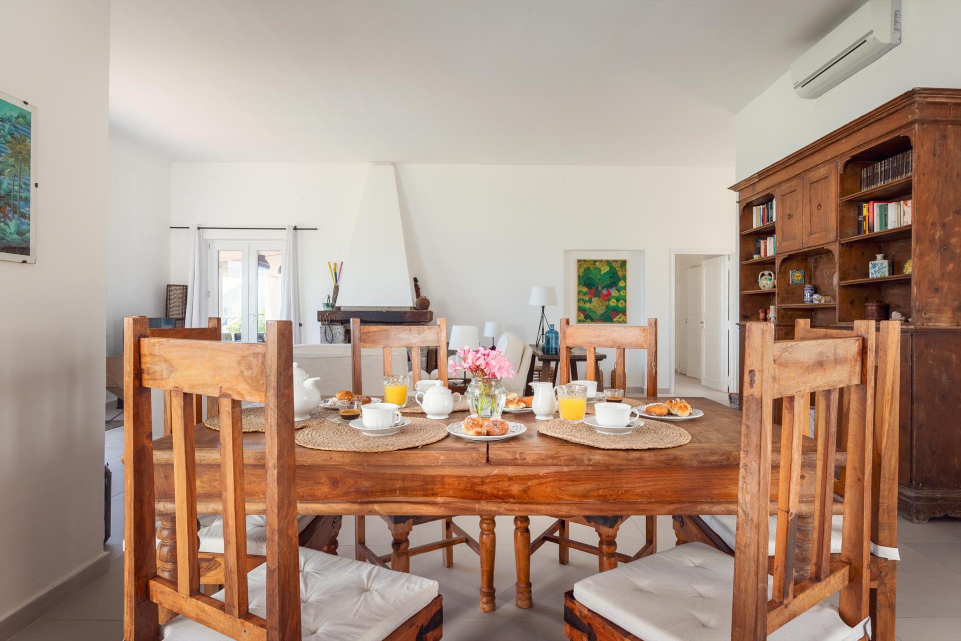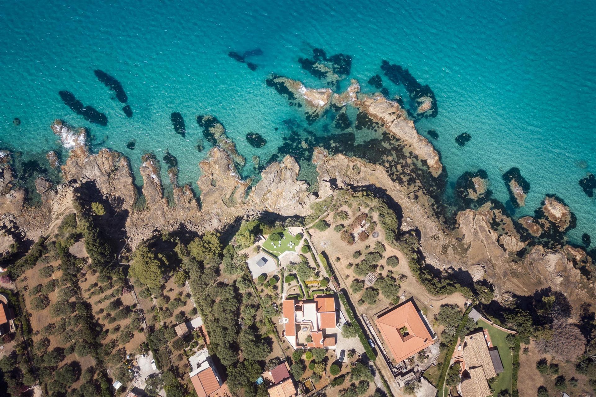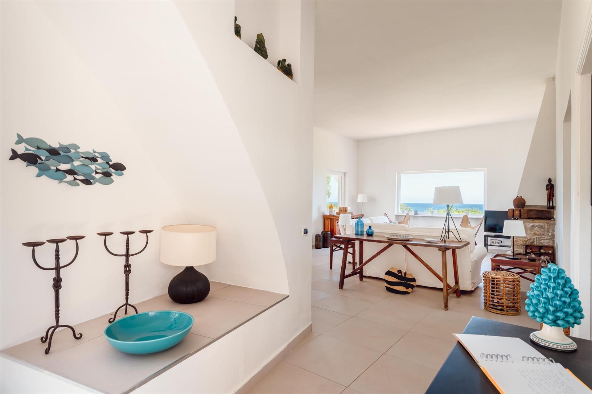 The villa is surrounded by an extensive Mediterranean garden with palm trees, olive trees, oleander bushes, bougainvillea and other typical Mediterranean plants. The garden is characterized by a magnificent, recently renovated area. Low dry-stone walls surround this area of the garden where you can relax with breathtaking views and enjoy an aperitif or just relax. From the garden you can access the small rocky beach below through a private gate.