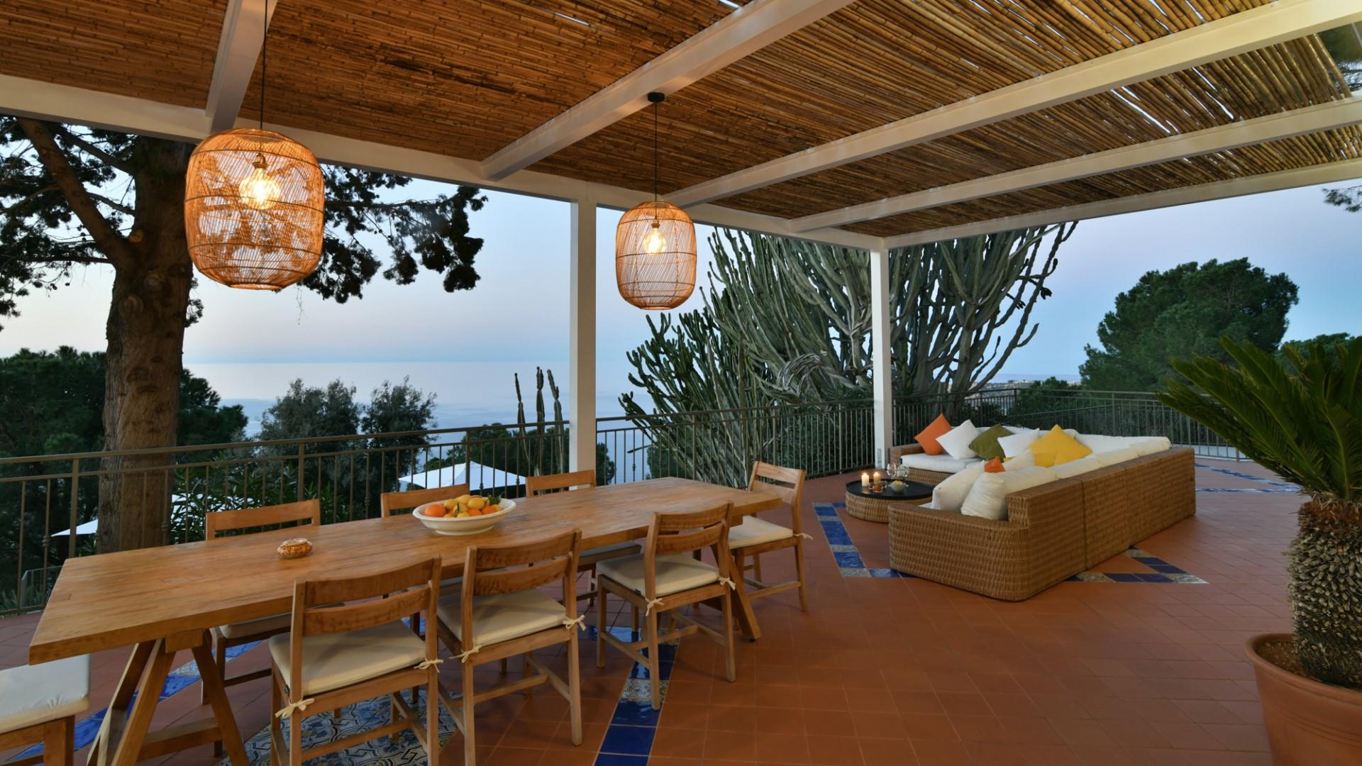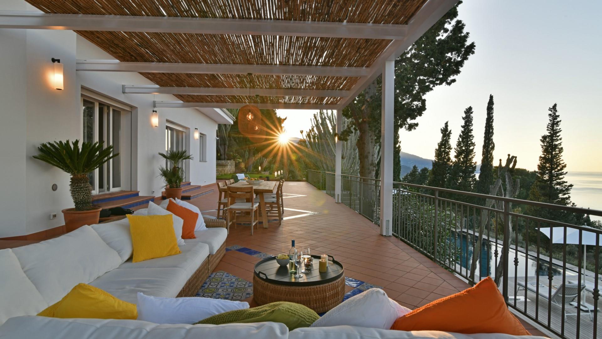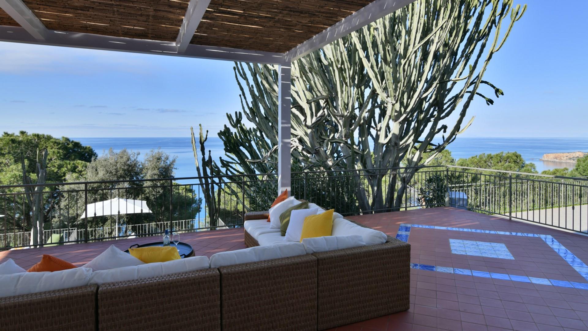 The land surrounding the house is about 9000 square metres, on which olive trees, citrus plants, majestic pines and cacti dwell. The terrace in front of the house tiled with ceramic and terracotta tiles is a delightful space where one can relax on the large sofa and where one can dine outside under the canopy of reeds with a beautiful view of the pool and the sea.