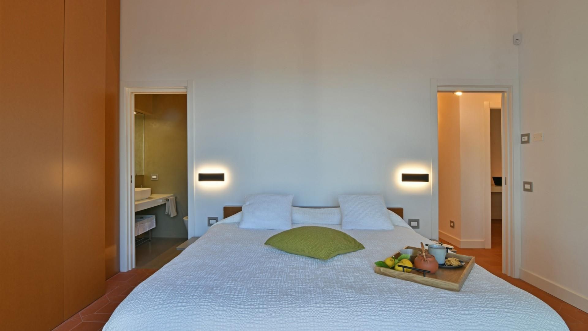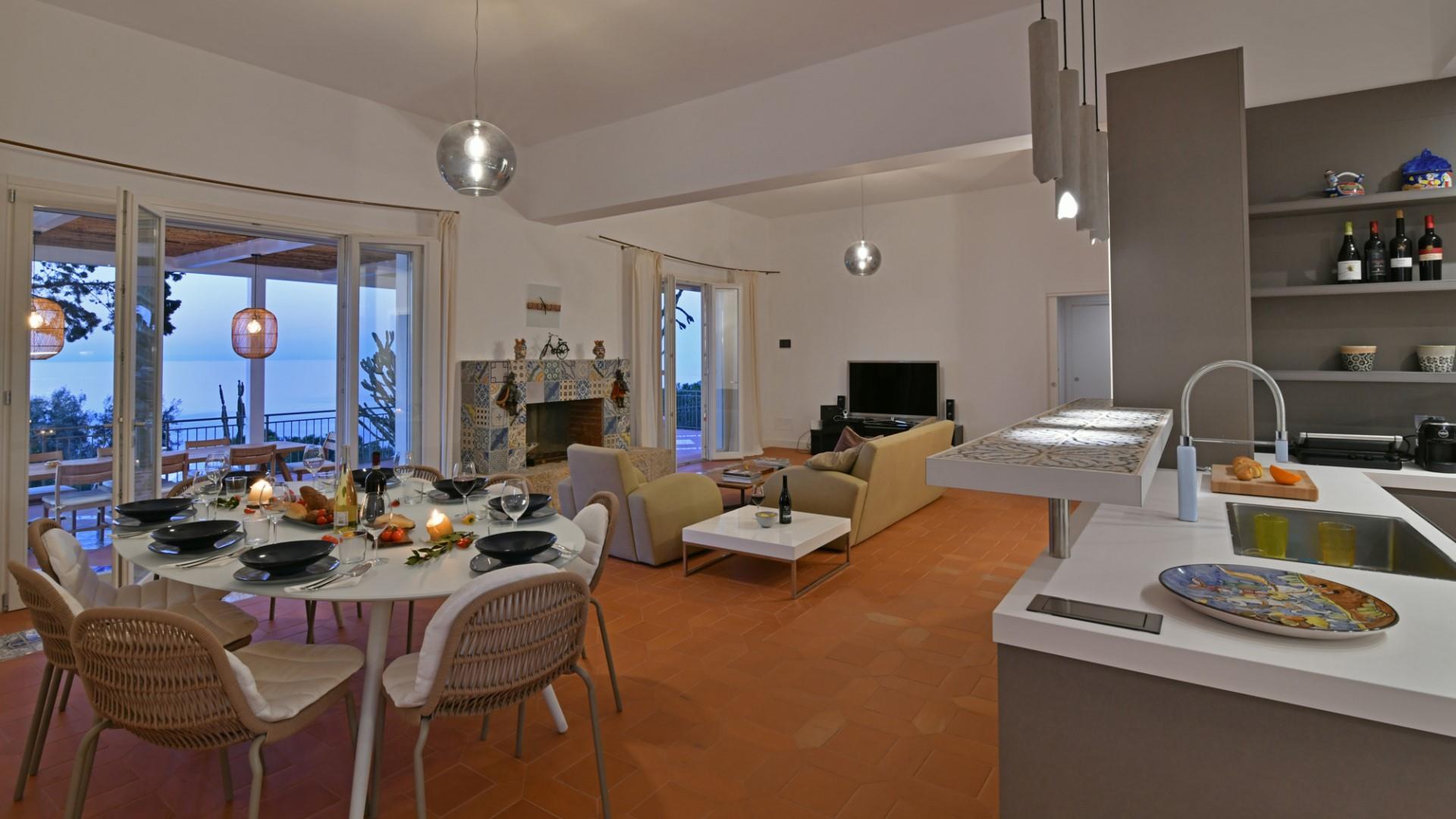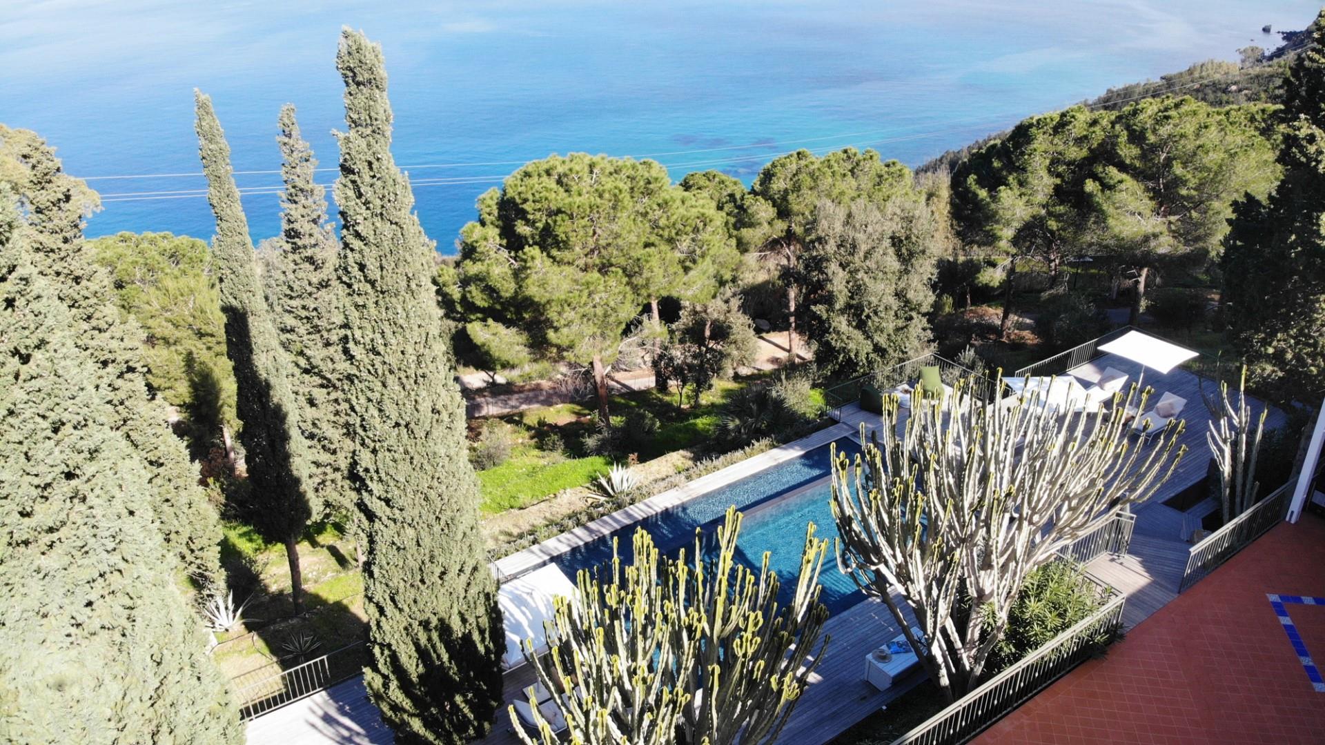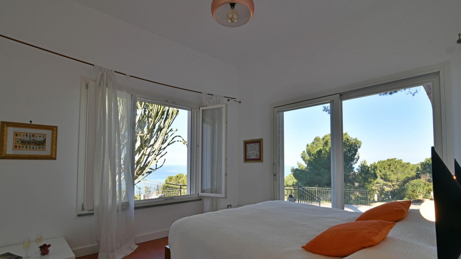 The large terrace is accessed from the private parking area by a few steps. One is immediately greeted by the outside sitting room and it is from here that the French window leads to the interior of the house which is on one floor. One enters into a single bright room that encloses the dining room, the modern and well-equipped kitchen and the living room with decorative fireplace. Adjacent is a service bathroom. From the living room one reaches the sleeping area: on the left a double bedroom with sea view and French window with direct access to the garden and en suite bathroom with tub and shower. To the right of the living room, passing through the corridor, are distributed the laundry room, a double bedroom with access to the terrace and en suite bathroom with tub, a double bedroom and a double bedroom with French size bed (1.40m) sharing a bathroom with shower.