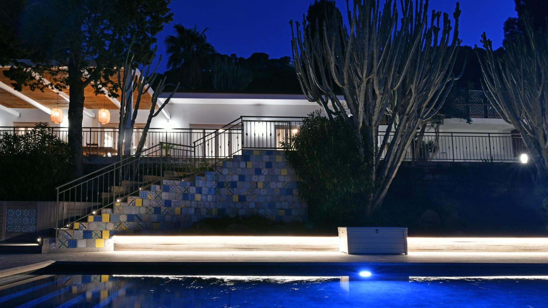 The pool area is located on a lower terrace than the villa, from which it is about 10 m away, and is reached by a staircase of 15 steps. From here there is a view of the sea and on clear days the Aeolian Islands, Alicudi and Filicudi can be seen on the horizon. The infinity pool is rectangular in shape, 4 x 11 m wide and 1.30 m deep. It is bordered by a large wooden solarium of about 50 square metres where sun loungers, parasols and a sun shower are positioned. The pool is sanitised with chlorine and salt, is lined with PVC and is accessible by a brickwork staircase. The pool is open from the last Saturday in April to the first Saturday in November.