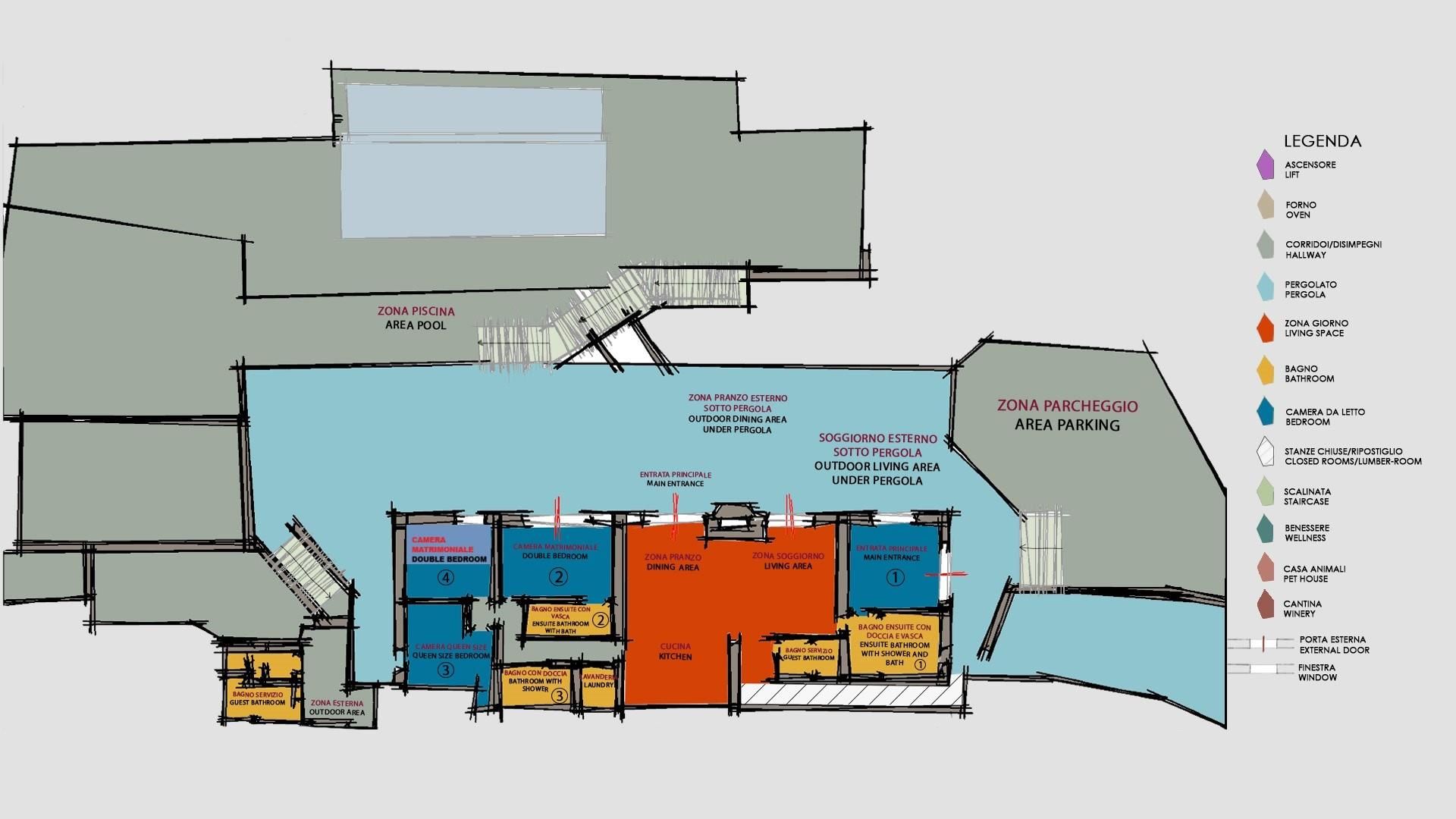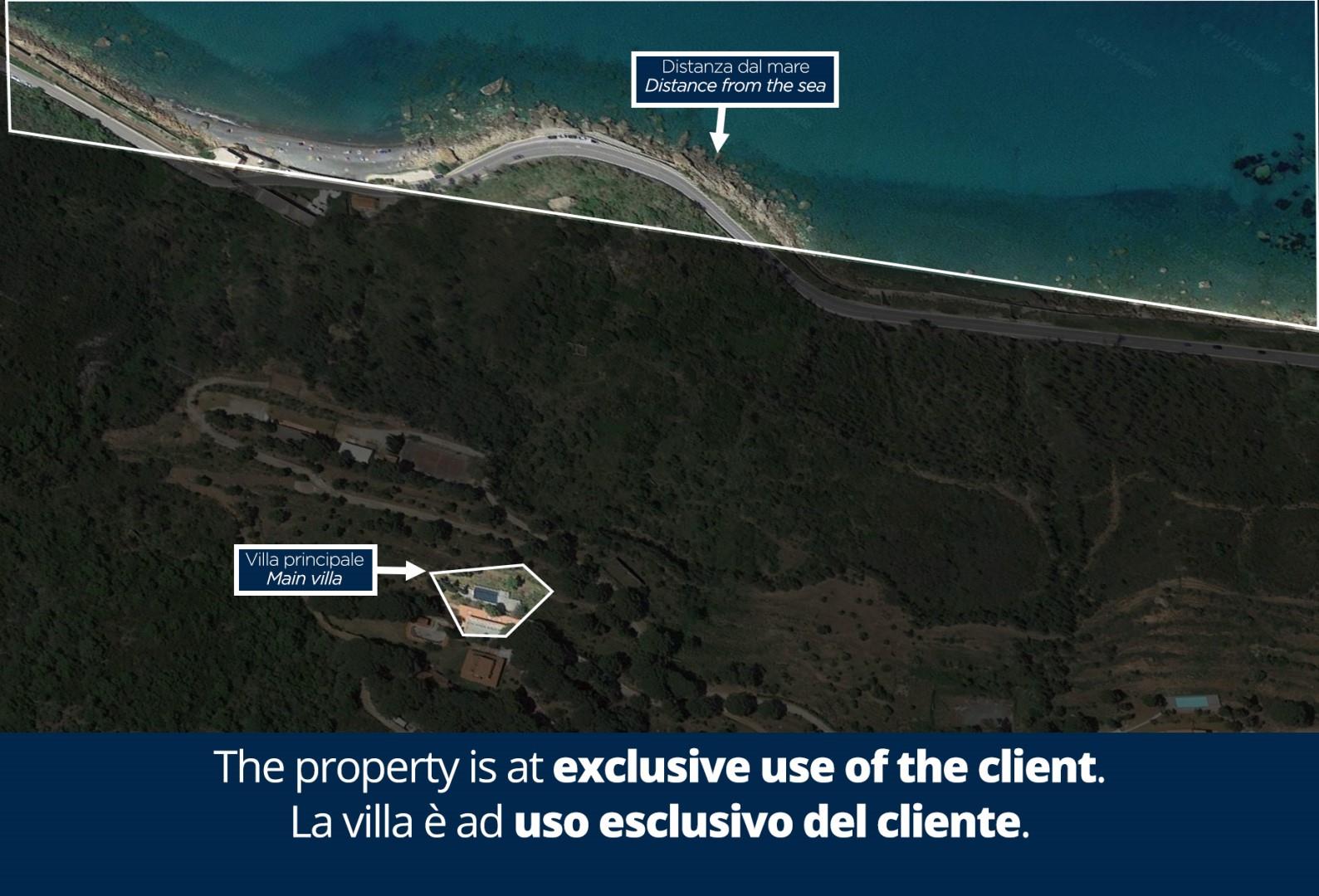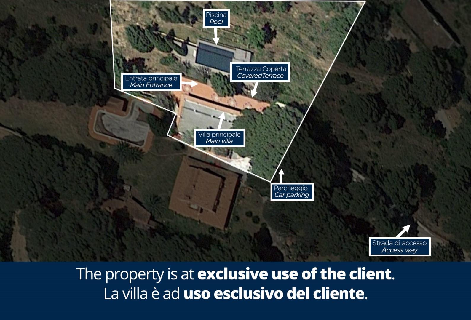 - Access road: From the main gate on SS113 there is an automatic gate to the residential area. (Opens with telephone number). Follow 800 m of slightly bumpy asphalt road to the automatic gate of the villa from which you access the private parking area equipped with charging for electric cars.