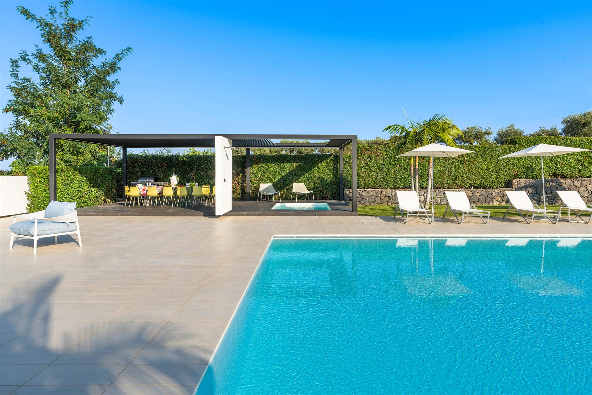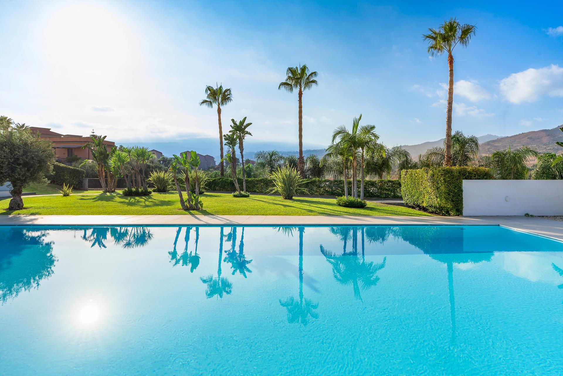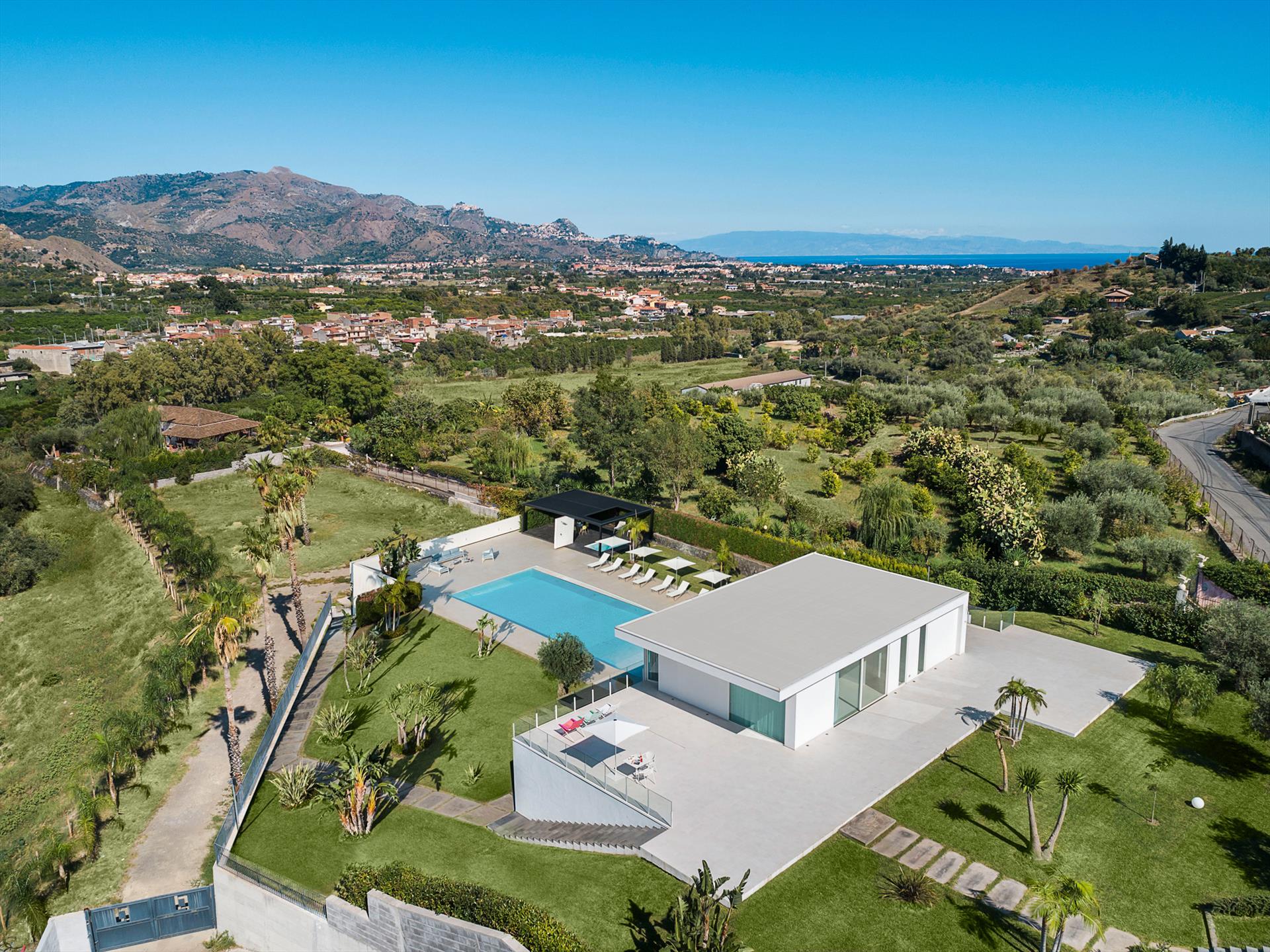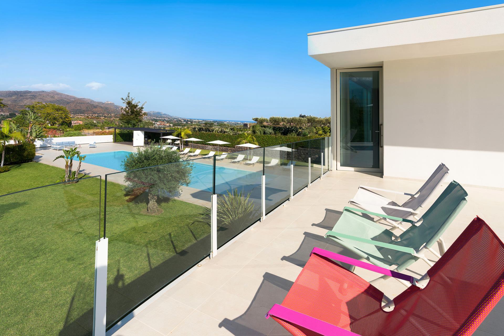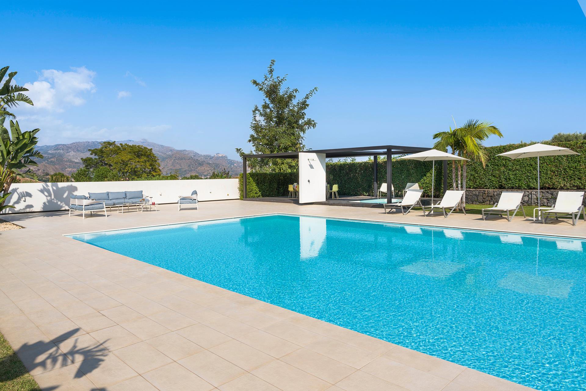 Villa Giardini is a luxurious villa with swimming pool located in the surroundings of Taormina. Ideal for a comfortable and relaxing holiday, the villa is surrounded by a beautiful garden with lawns, large terraces, a large private swimming pool (8 x 21 m) and a Jacuzzi. Recently built, this exclusive contemporary residence consists of a main house and an annexe.