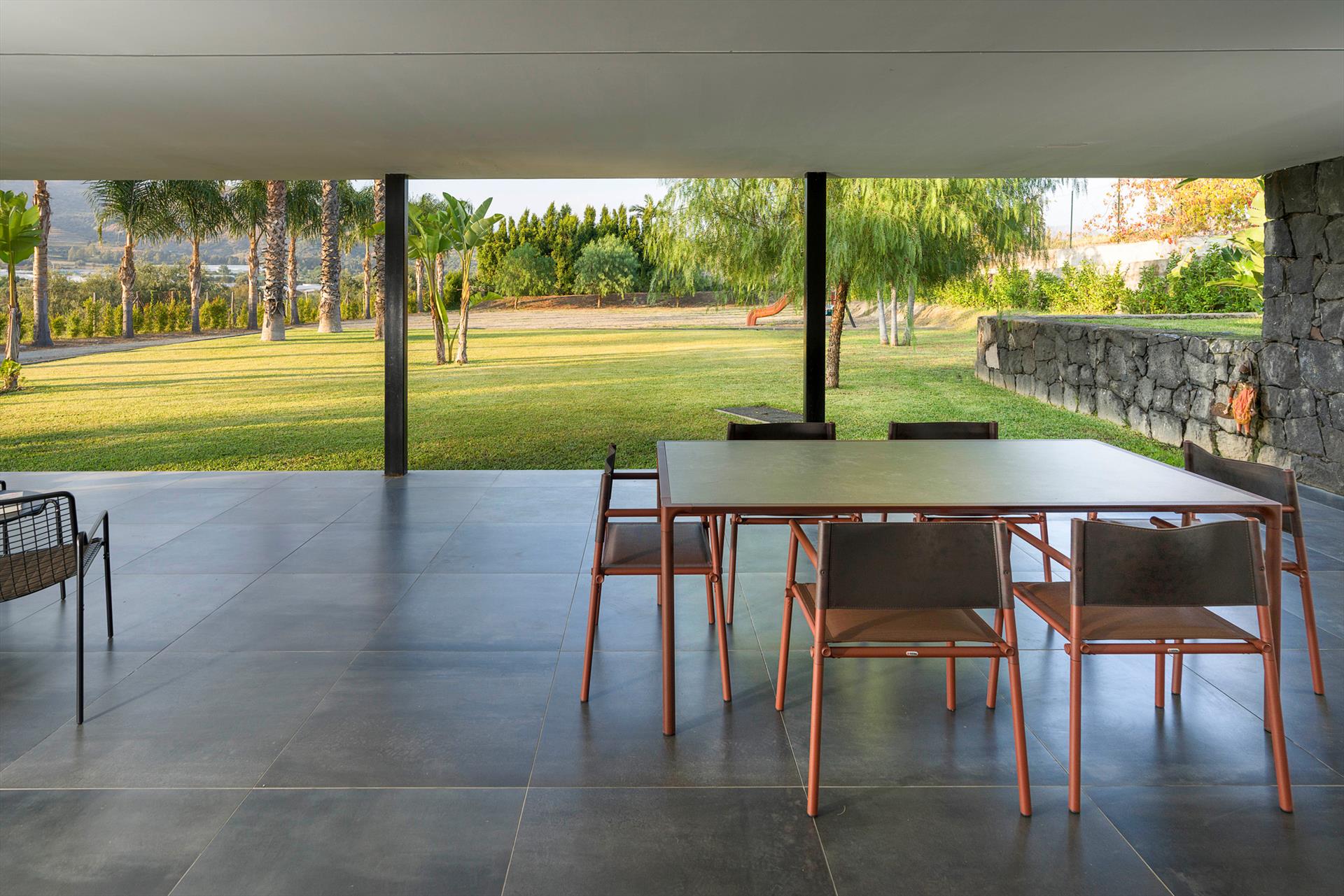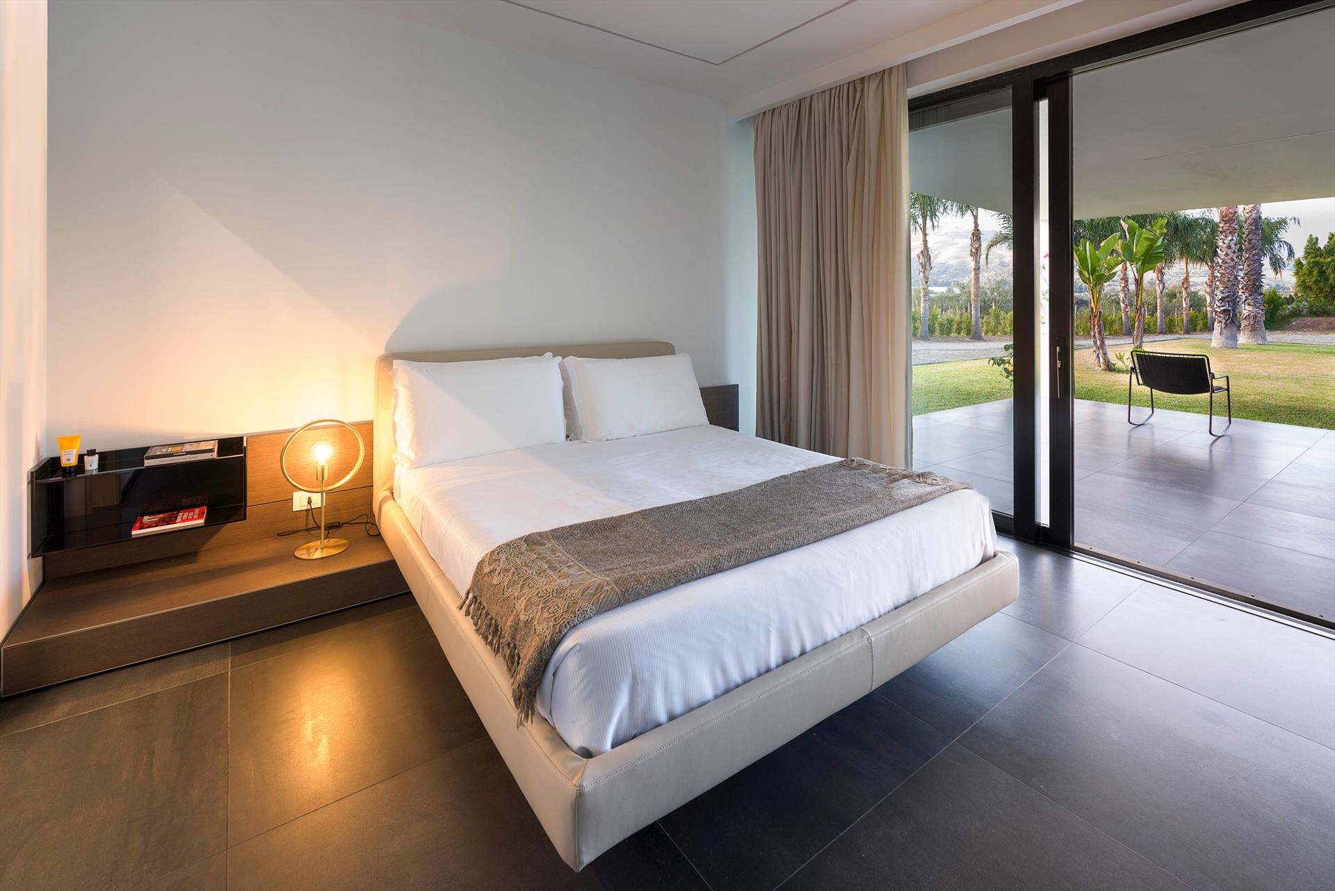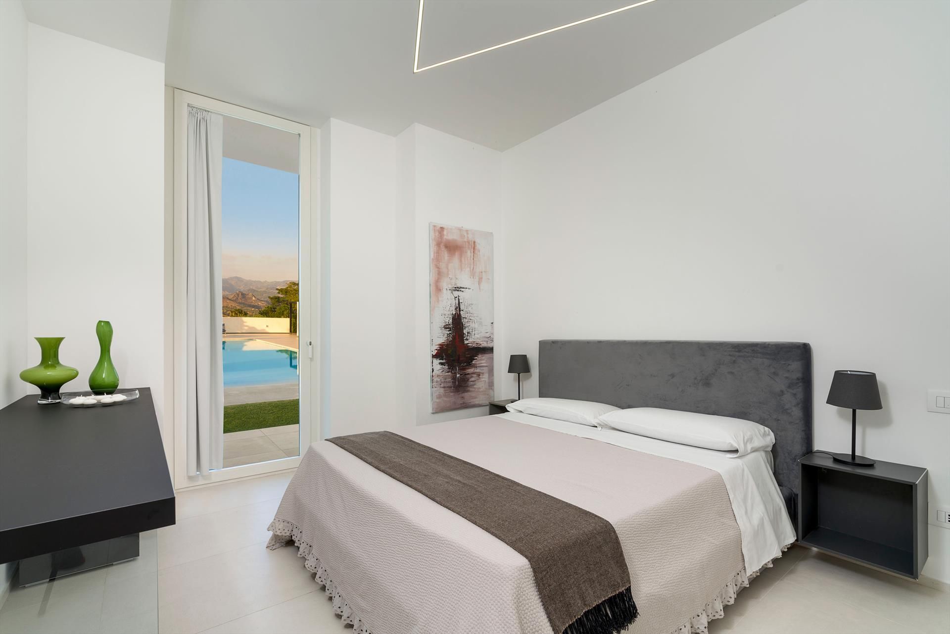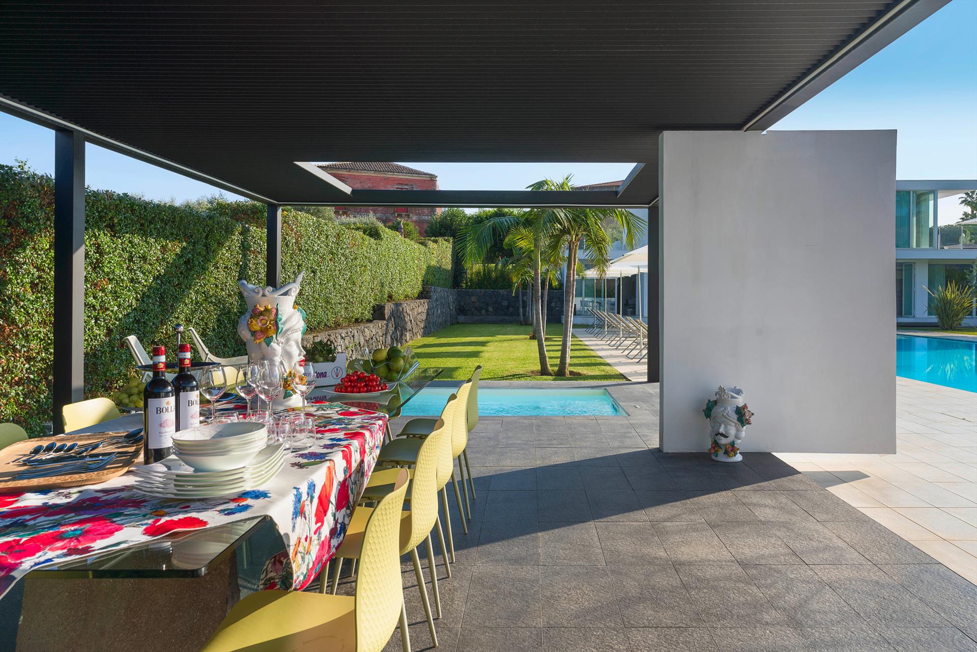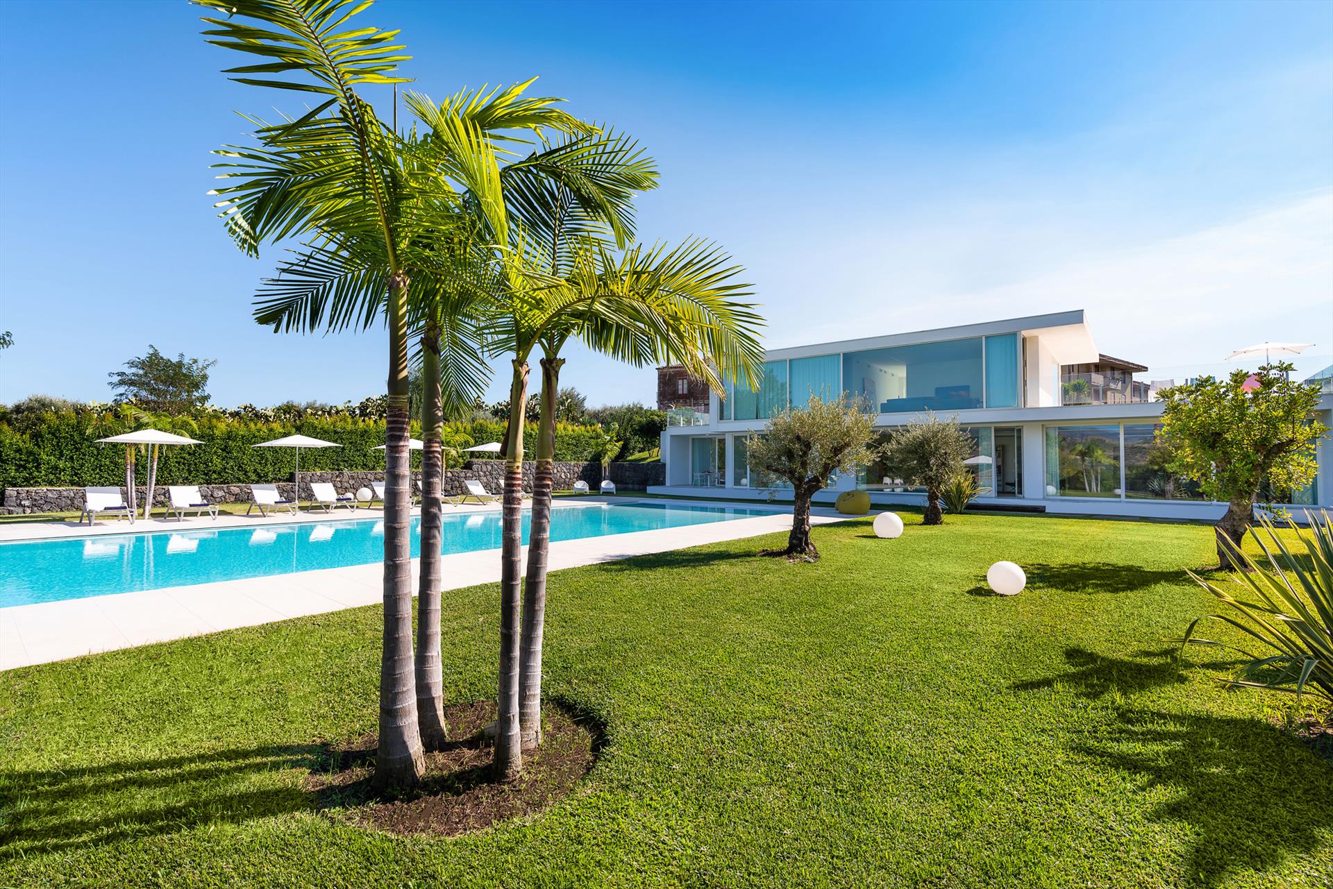 Villa Giardini is a luxurious villa with swimming pool located in the surroundings of Taormina. Ideal for a comfortable and relaxing holiday, the villa is surrounded by a beautiful garden with lawns, large terraces, a large private swimming pool (8 x 21 m) and a Jacuzzi. Recently built, this exclusive contemporary residence consists of a main house and an annexe.