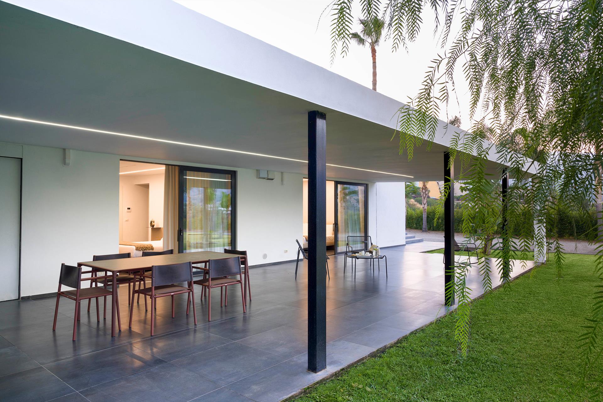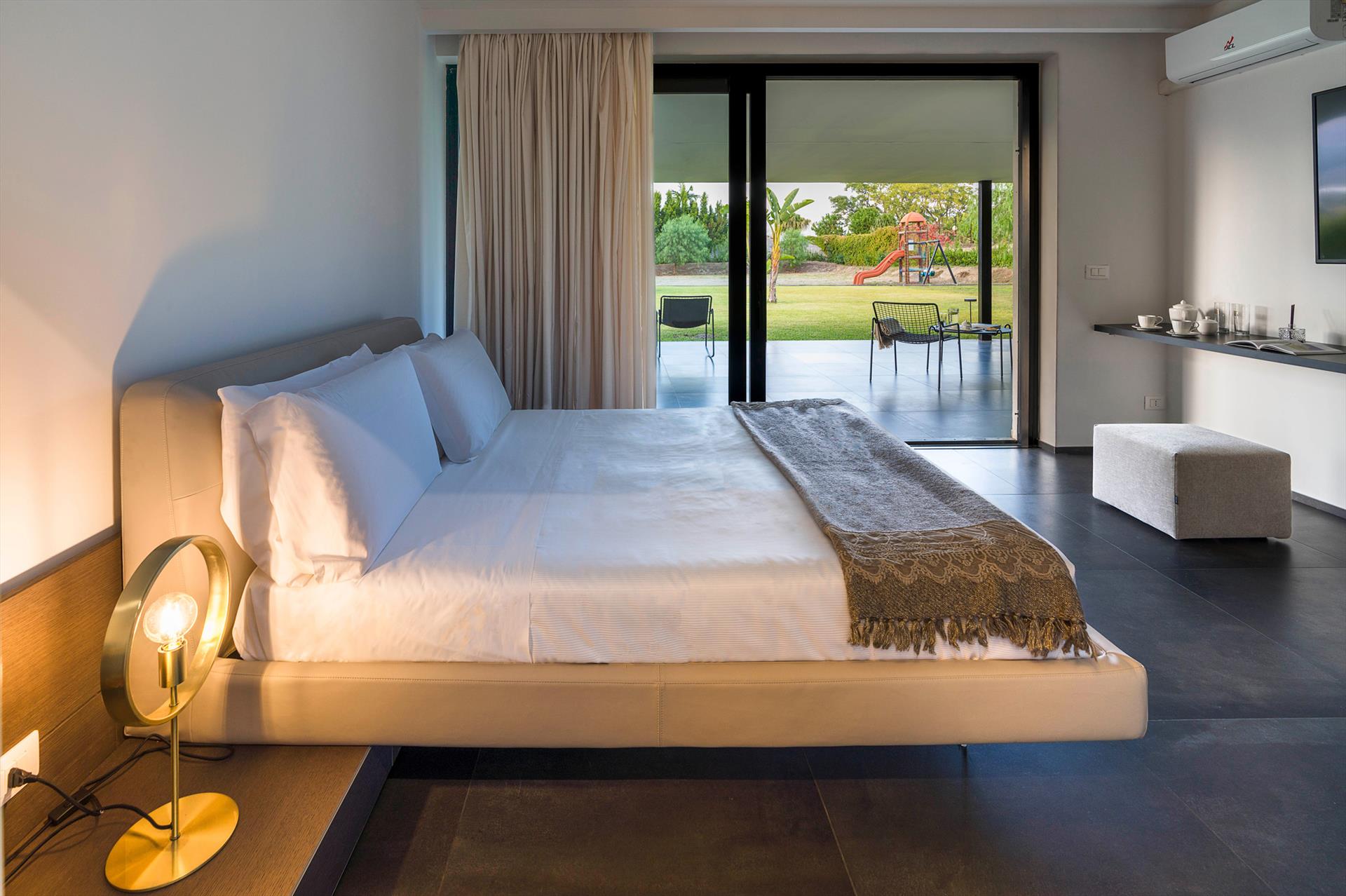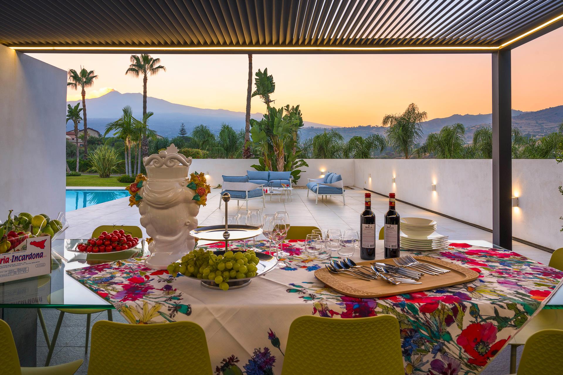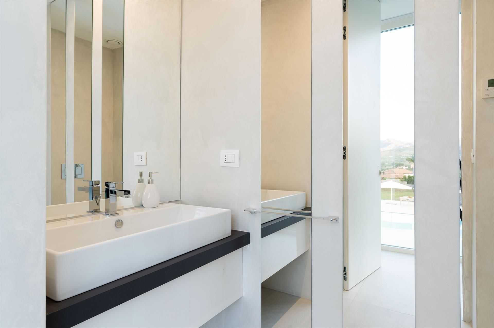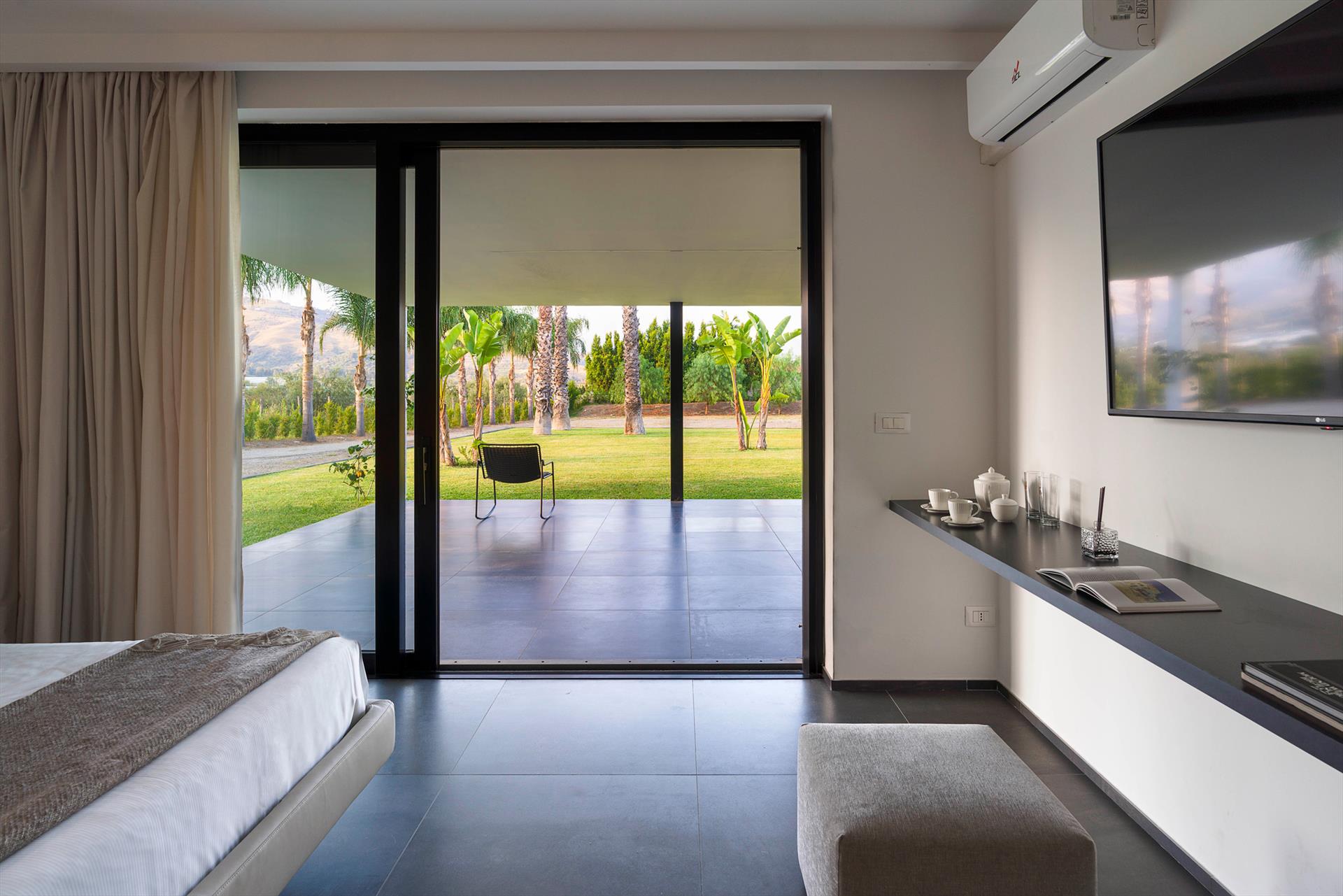 Villa Giardini is a luxurious villa with swimming pool located in the surroundings of Taormina. Ideal for a comfortable and relaxing holiday, the villa is surrounded by a beautiful garden with lawns, large terraces, a large private swimming pool (8 x 21 m) and a Jacuzzi. Recently built, this exclusive contemporary residence consists of a main house and an annexe.