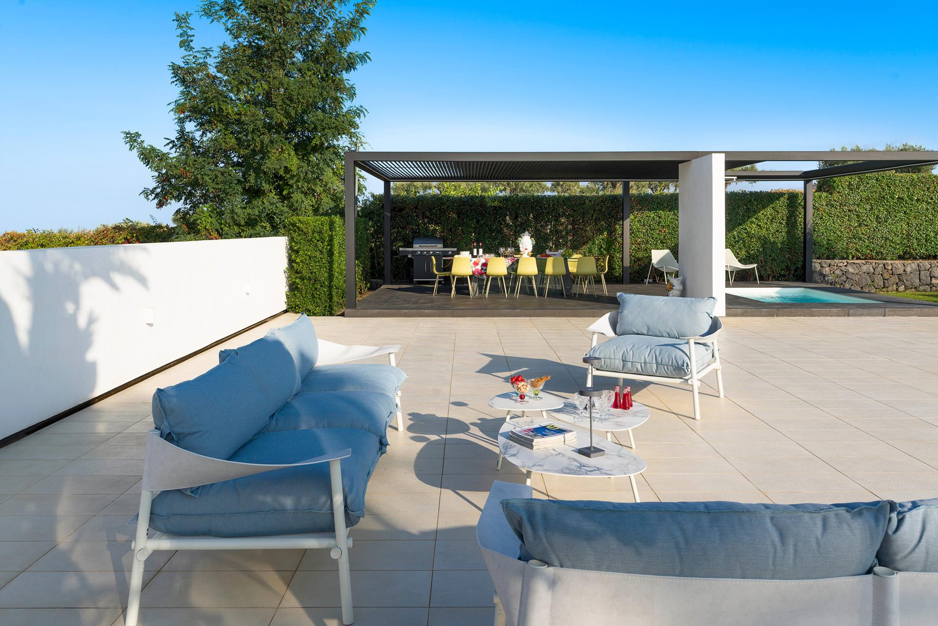 - External equipment: barbecue, beach chairs, beach umbrella, chairs external shower, gazebo, outdoor lounge space, sun loungers, table