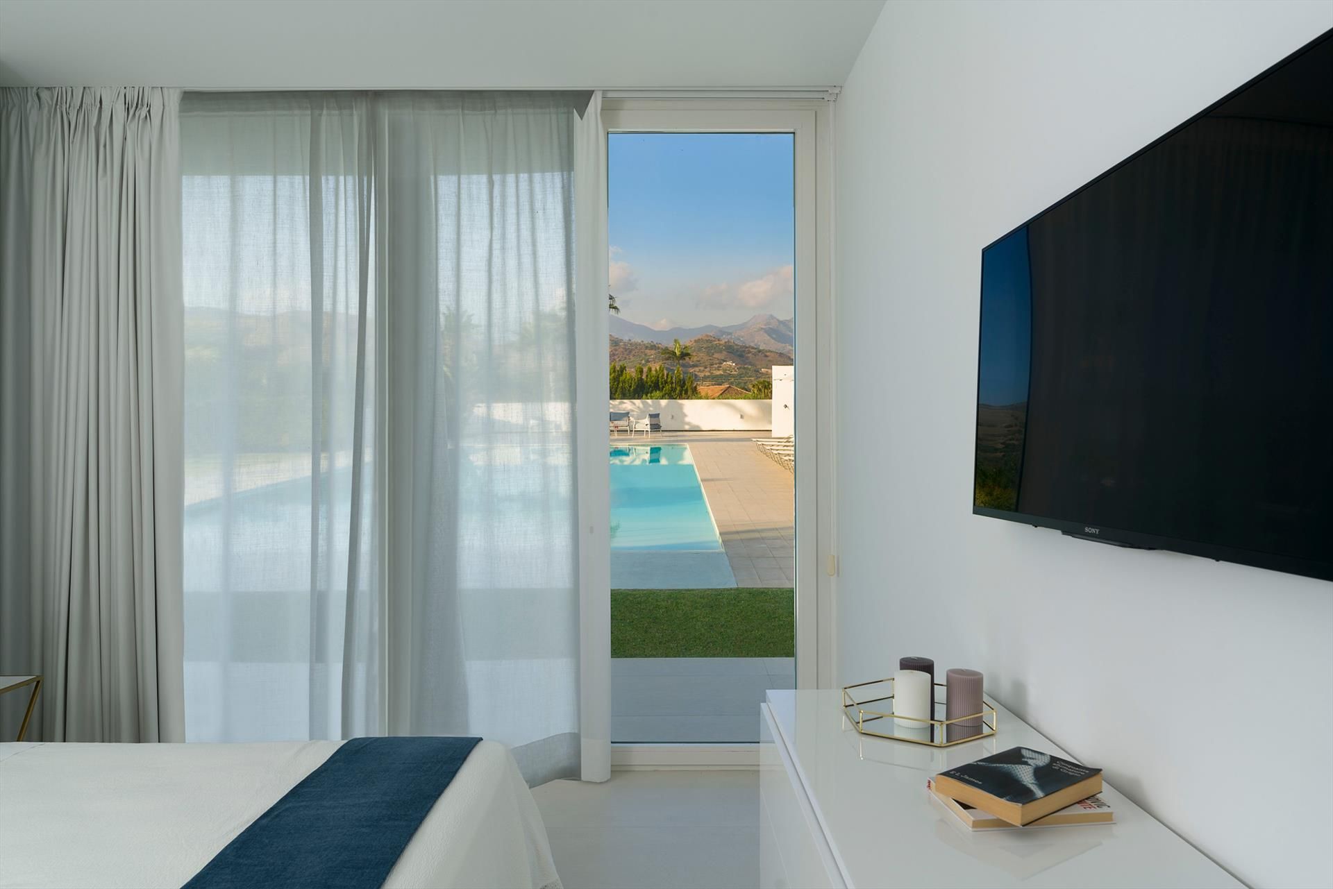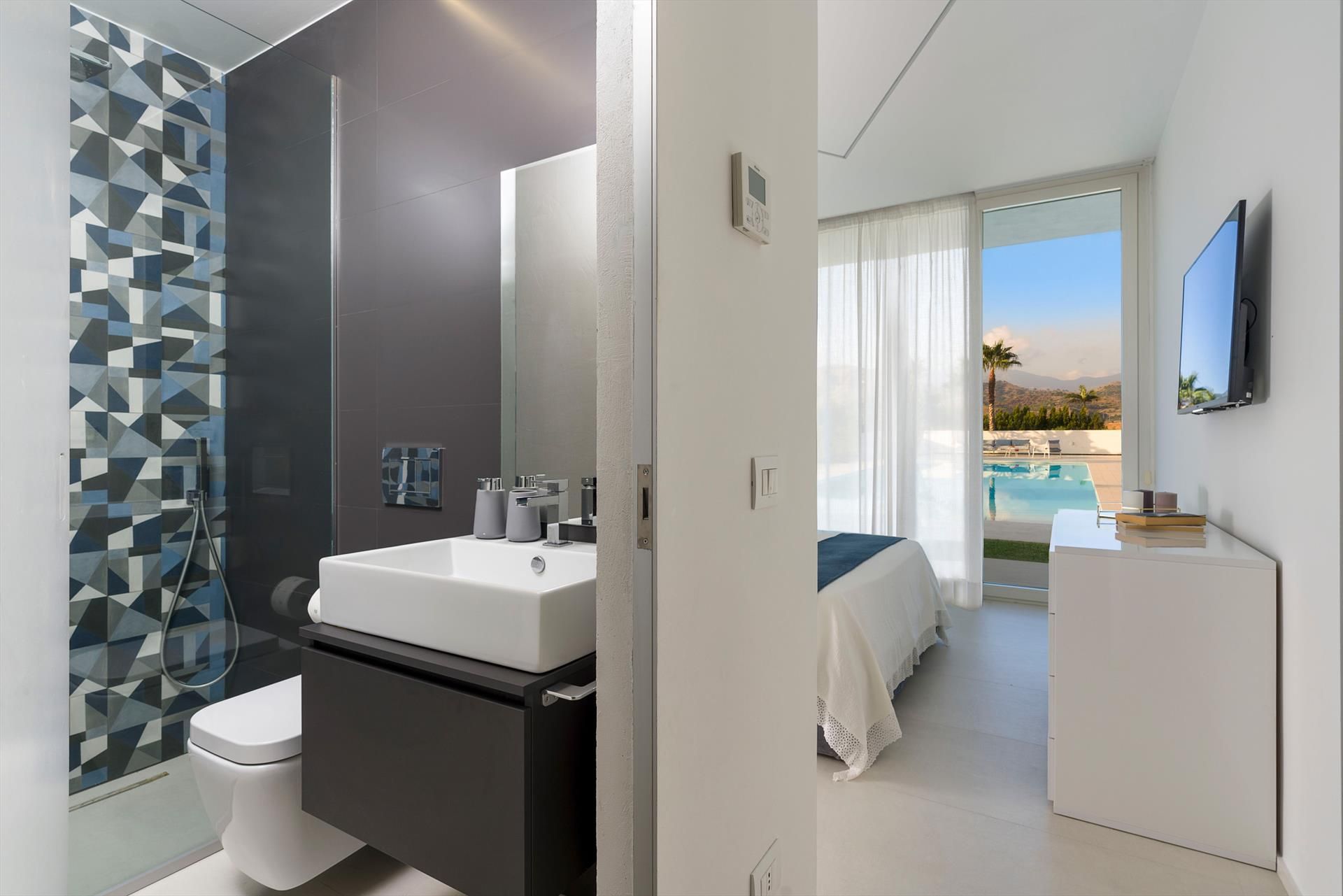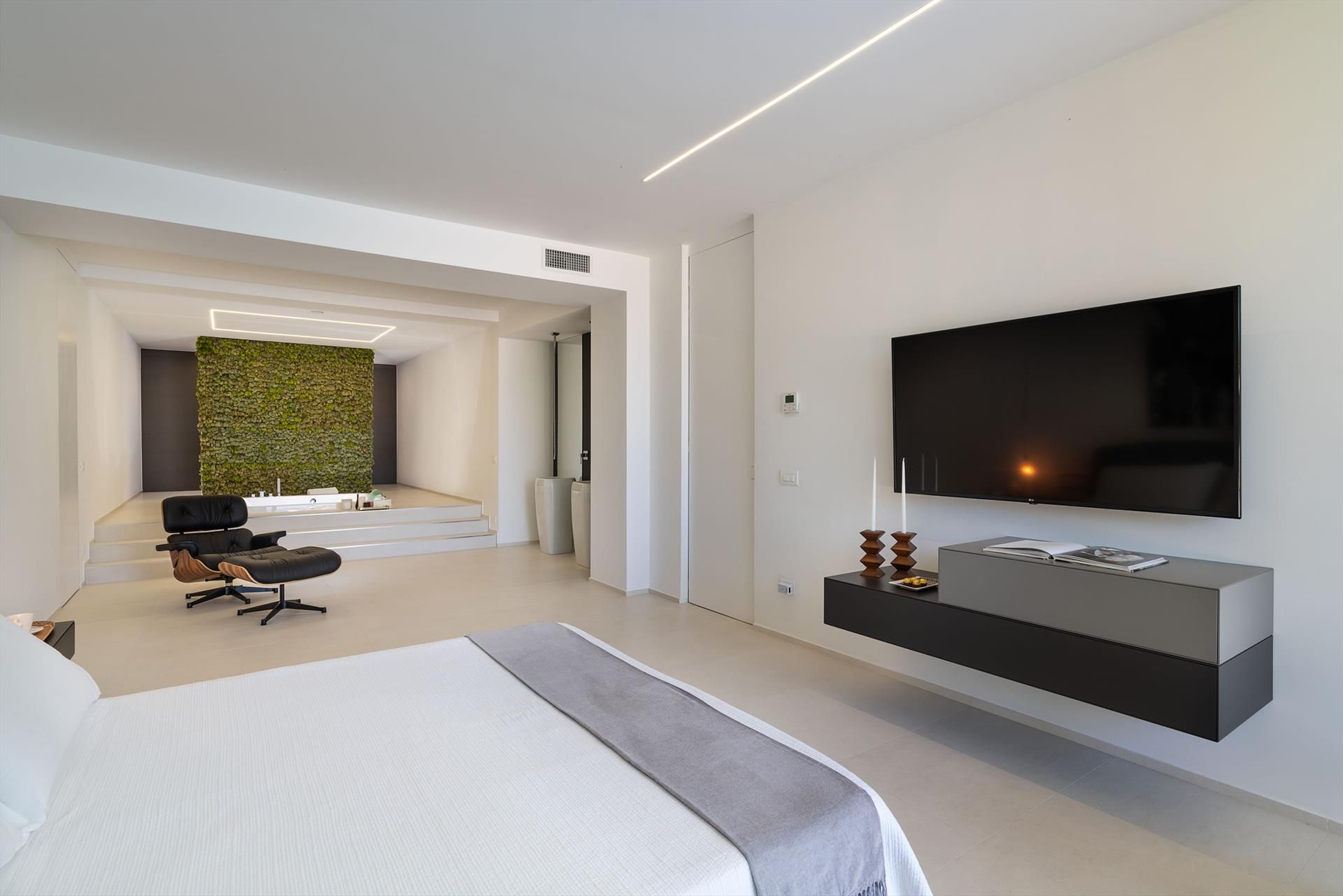 The main house - which is on two levels - has cosy, light-filled interiors that open onto the garden and the surrounding landscape through large floor-to-ceiling windows. The ground floor comprises a living area with kitchen, a luxurious master suite with an exposed whirlpool tub and private bathroom, two double bedrooms with en-suite bathrooms, and a fourth bathroom with shower. On the first floor, connected by an external staircase, there is a second living-dining room with kitchen, a double bedroom with en-suite bathroom, a twin bedroom and a service bathroom. While the annex accommodates two bedrooms with two bathrooms.
