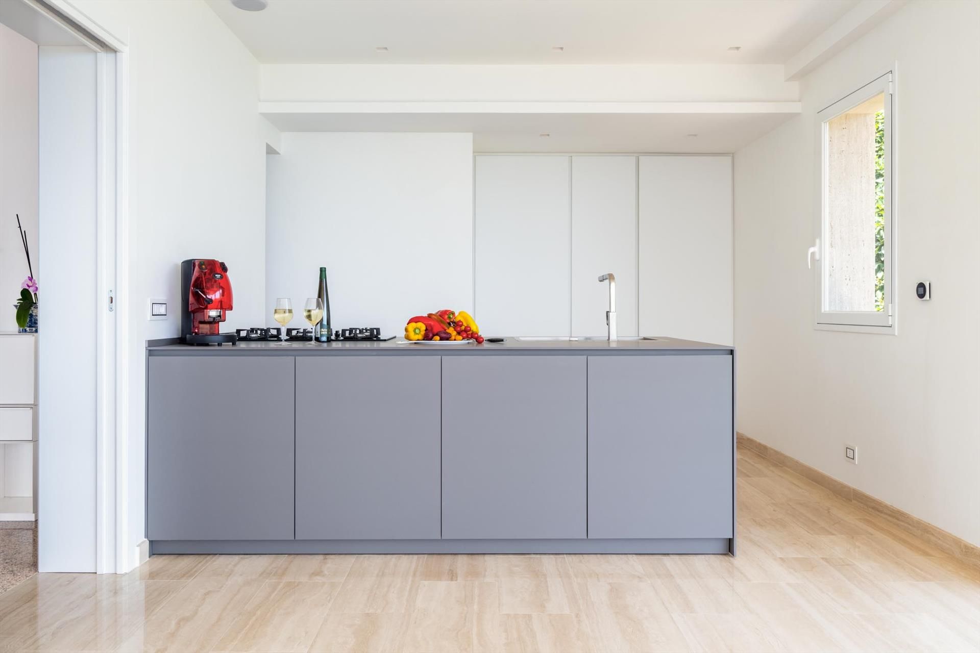- open kitchen with gas hob, electric oven, microwave, dishwasher, refrigerator-freezer, coffee machine, electric kettle and toaster