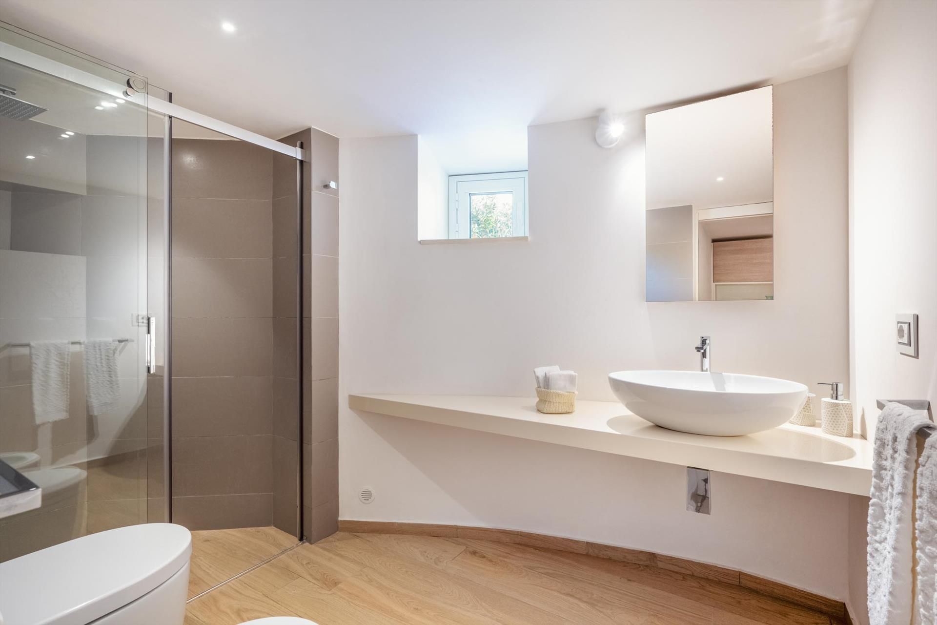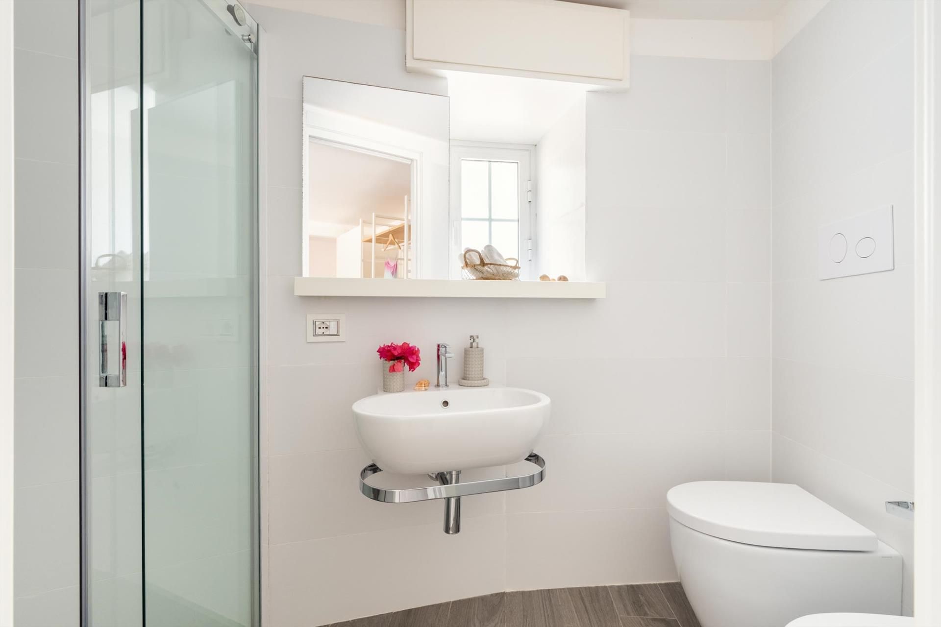 - bathroom with single washbasin, shower, toilet and hairdryer