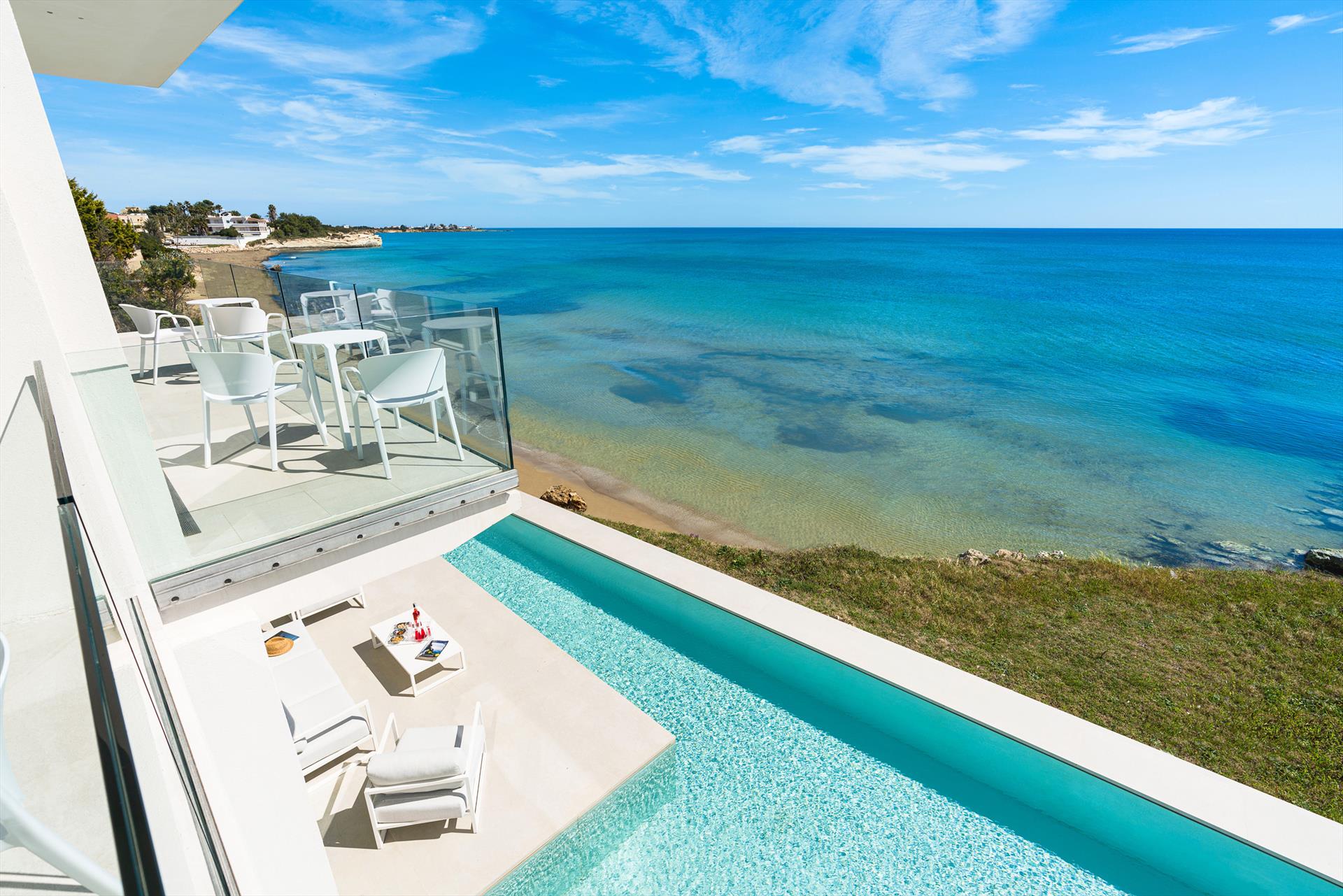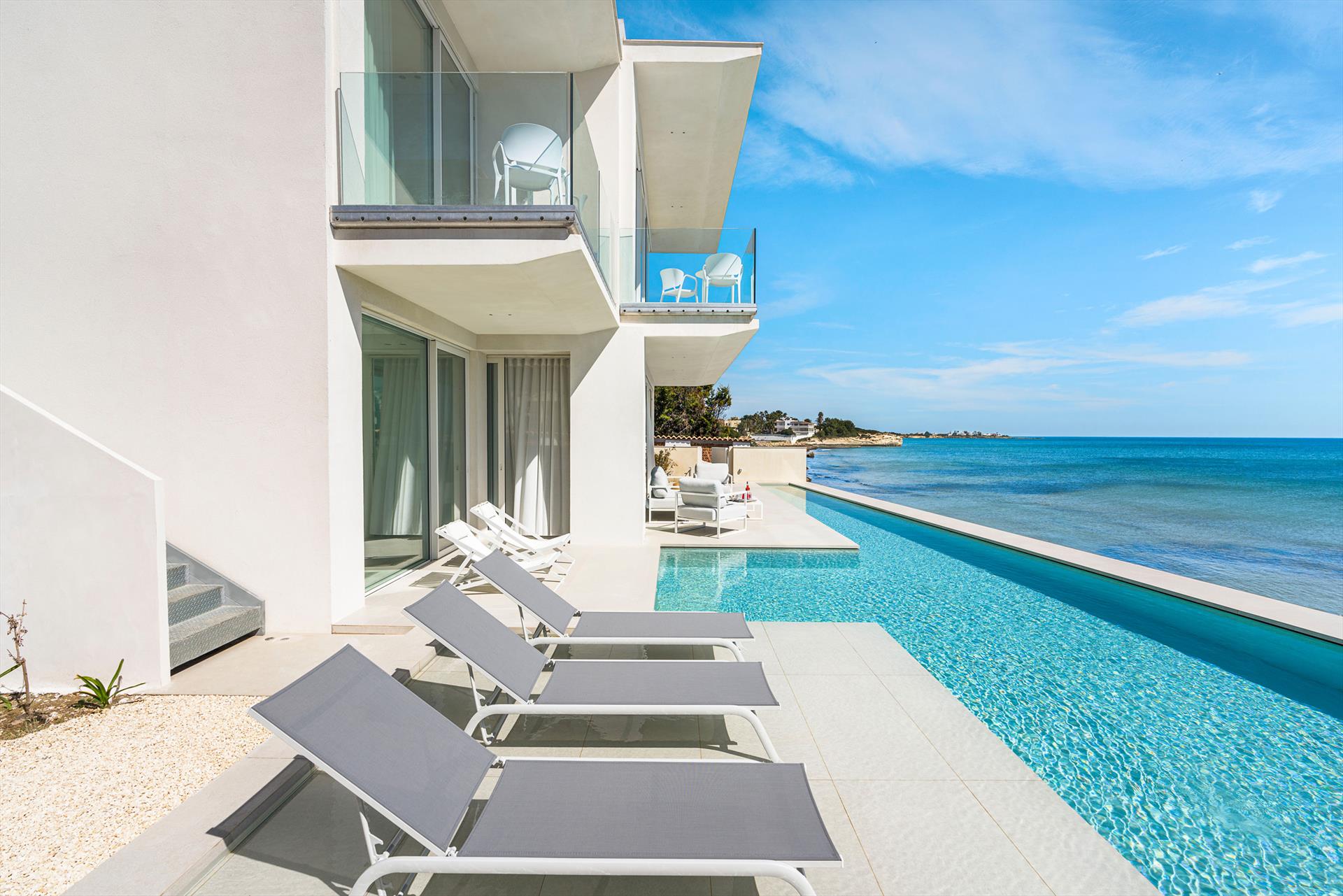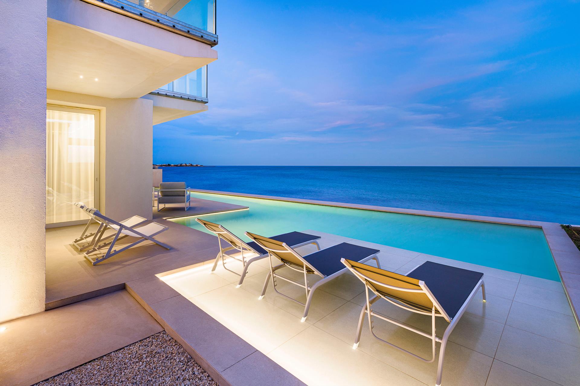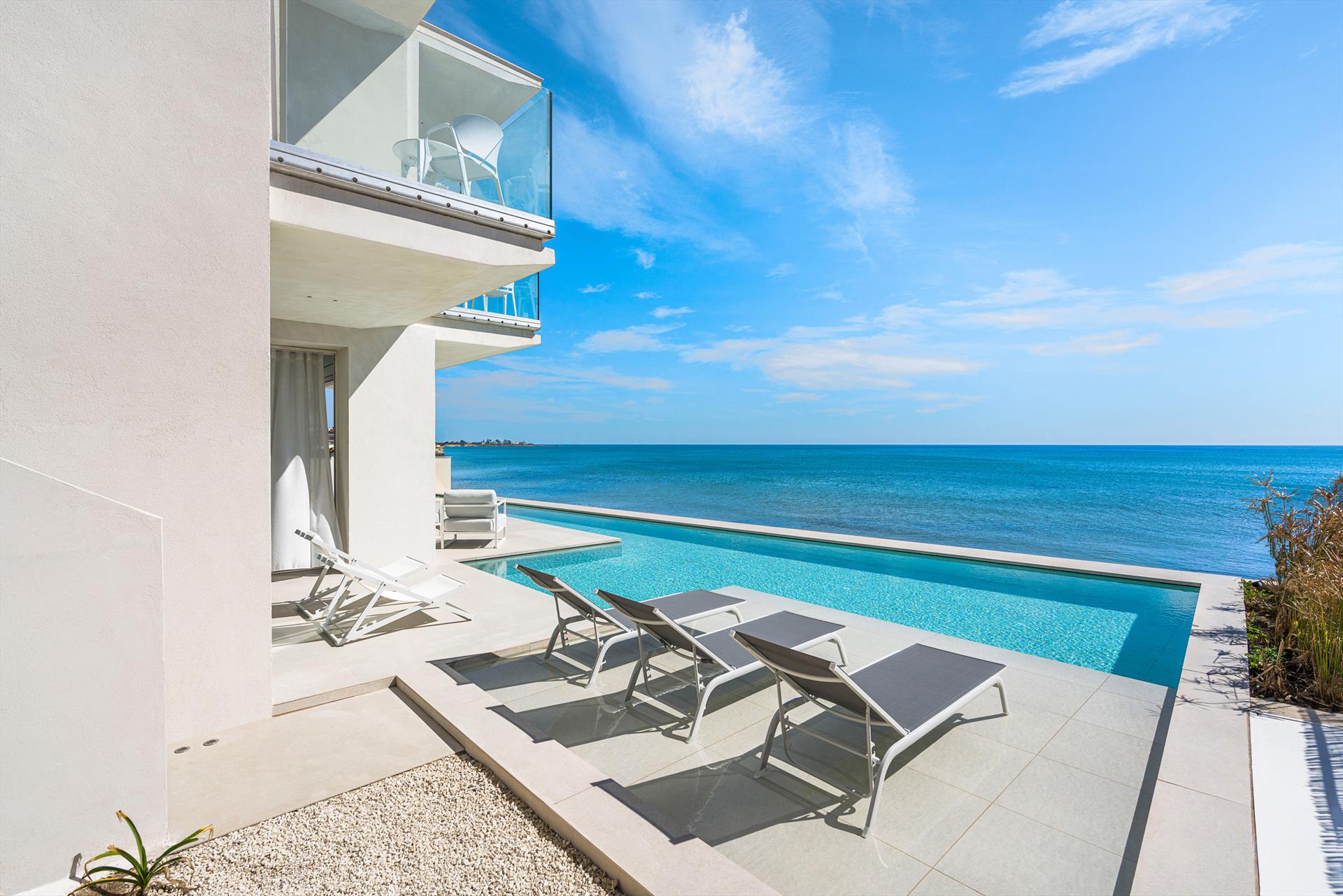 Villa Meraviglia is a modern and exclusive seafront property in Marina di Noto. Beautifully located along the southeast coast of Sicily, the villa is just a few kilometres from the historic centre of Noto and the Vendicari nature reserve. Surrounded by a small garden and spacious terraces, Villa Meraviglia features an exclusive salt-purified and heated swimming pool.