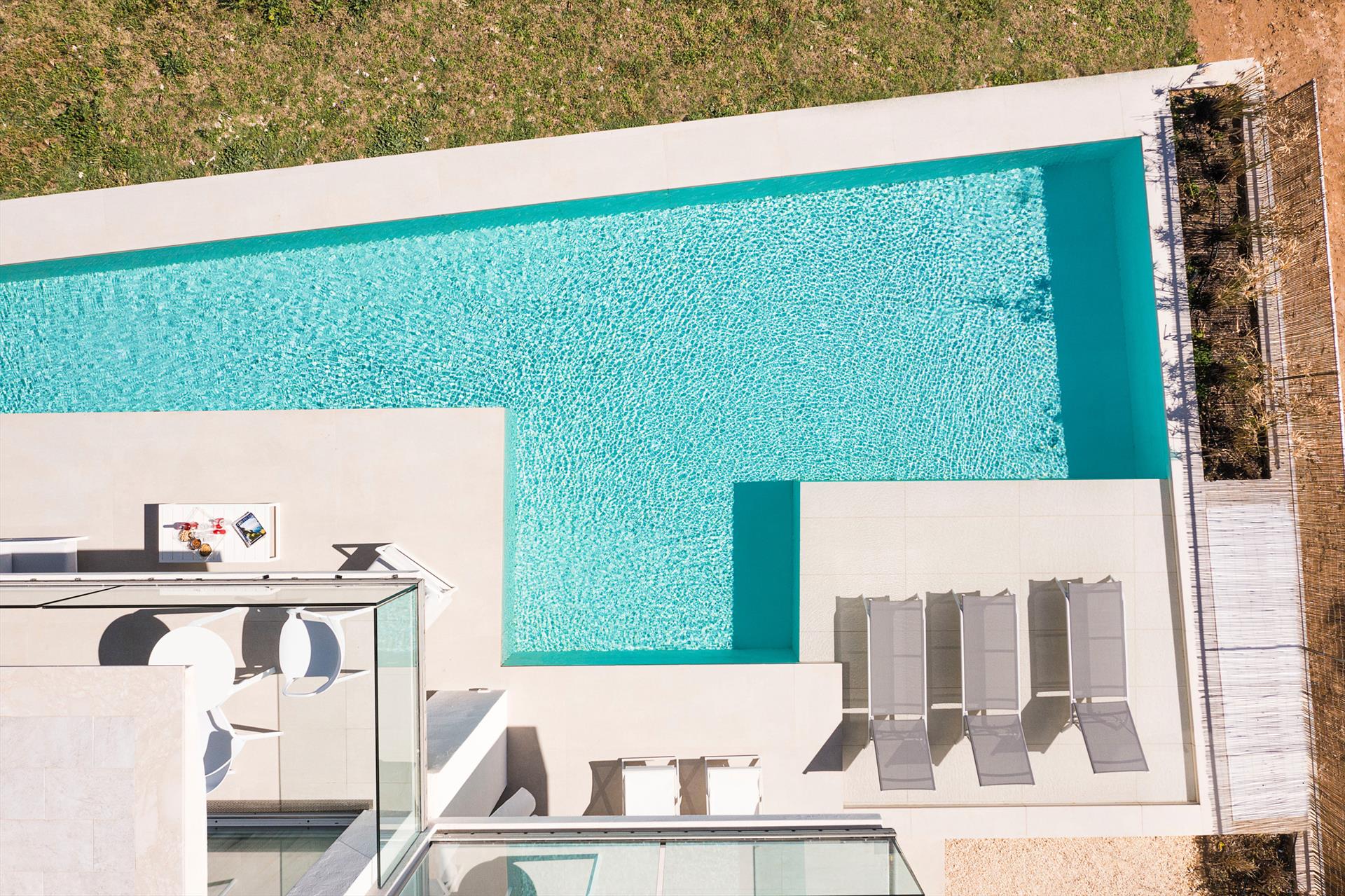 Private pool with hydro-massage corner Size (in metres) 3.50 x 17.00, depth (in metres) min 1.20 - max 1.20 Open from 01.01 to 31.12. Heated pool at 24-26°C. Depuration: salt