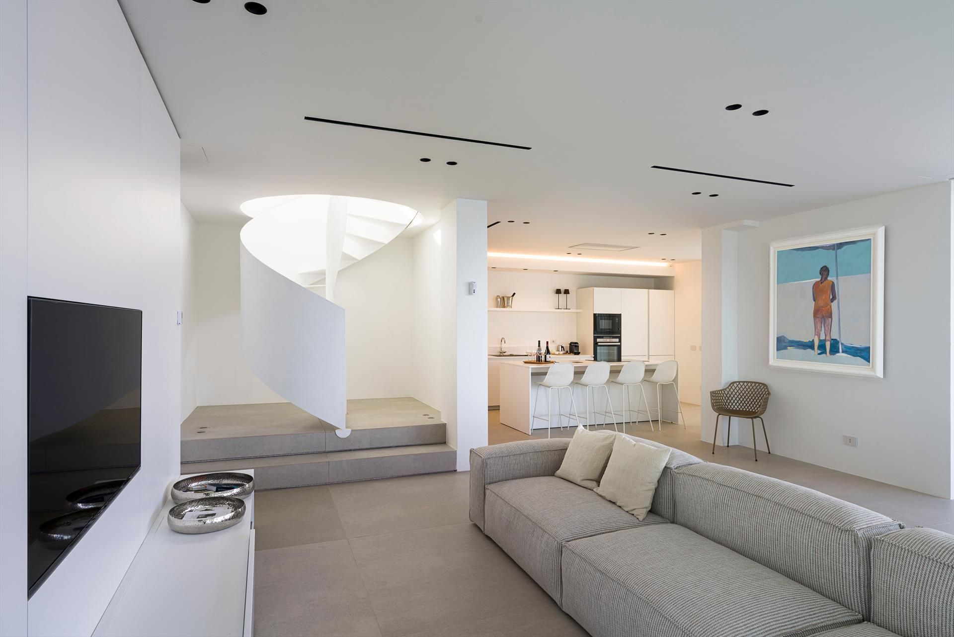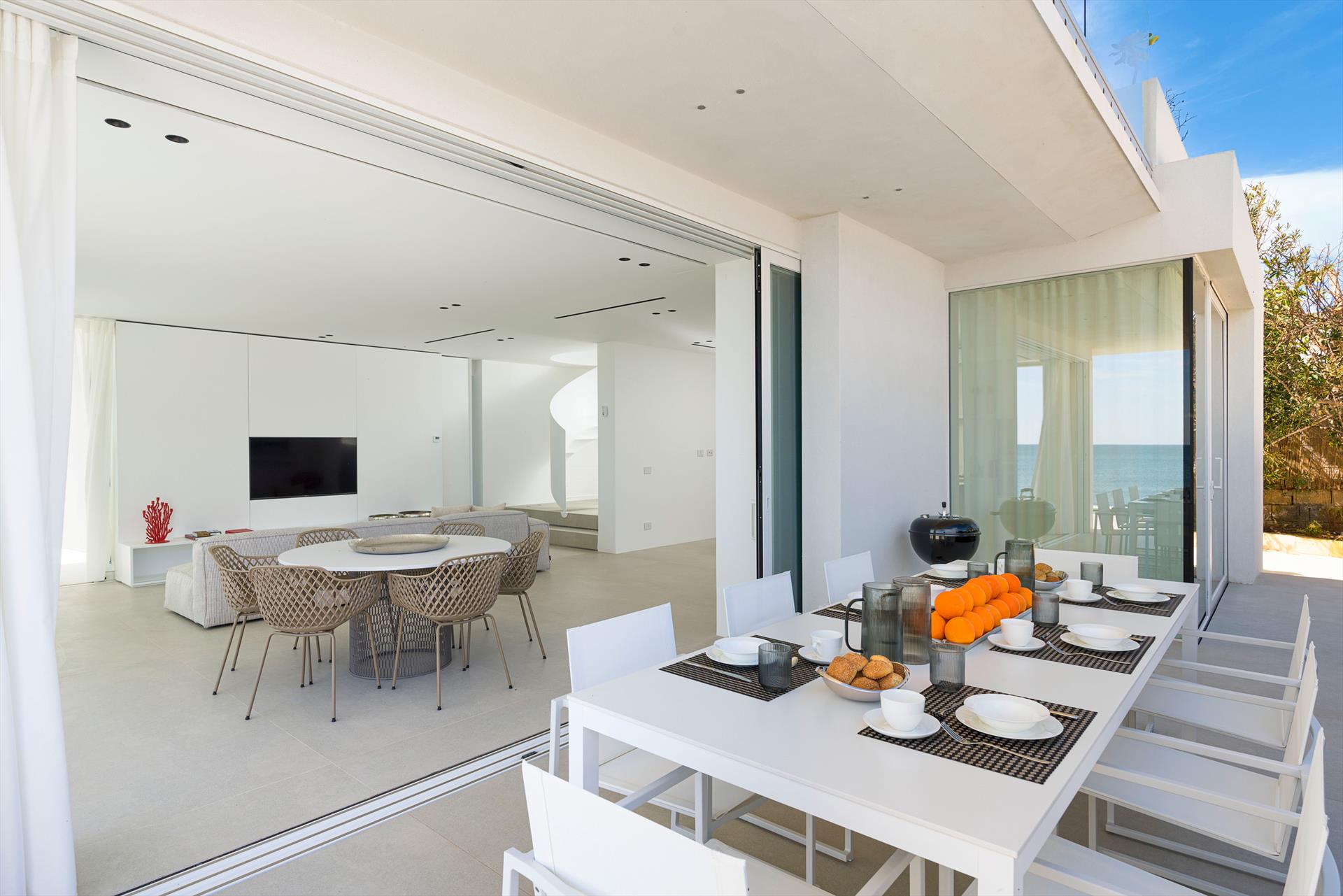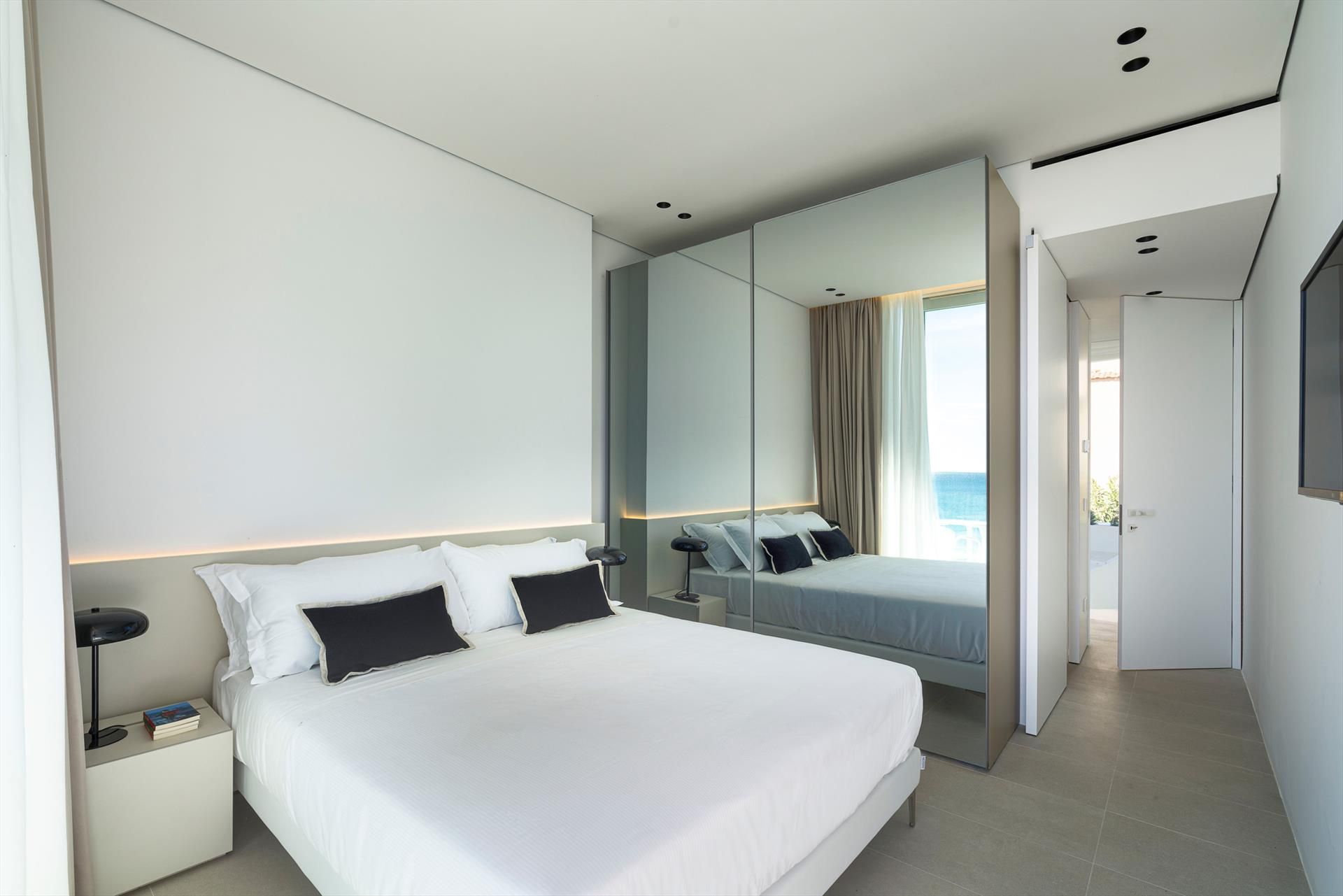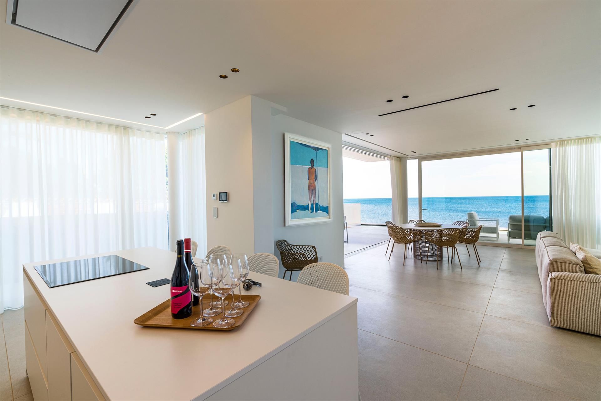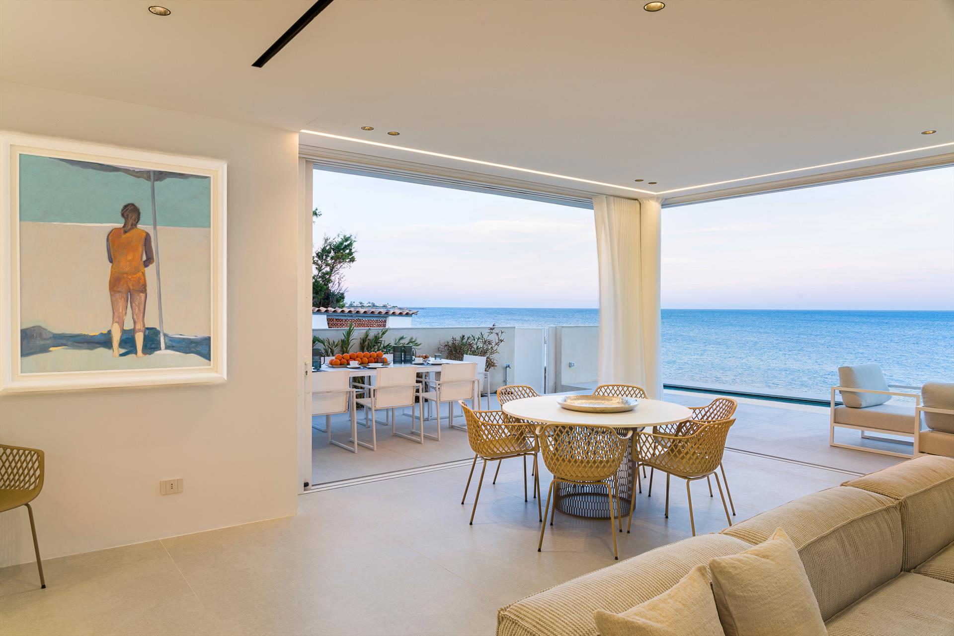 Its comfortable interiors, spread over two levels, have large panoramic windows open onto the sea and include a large living room, a kitchen, four double bedrooms, each with a bathroom with shower, and a terrace facing the sea. The amenities are also top-notch: air conditioning and heating in all rooms, Wi-Fi internet, washer-dryer, dishwasher, Nespresso coffee machine, electric oven and microwave.