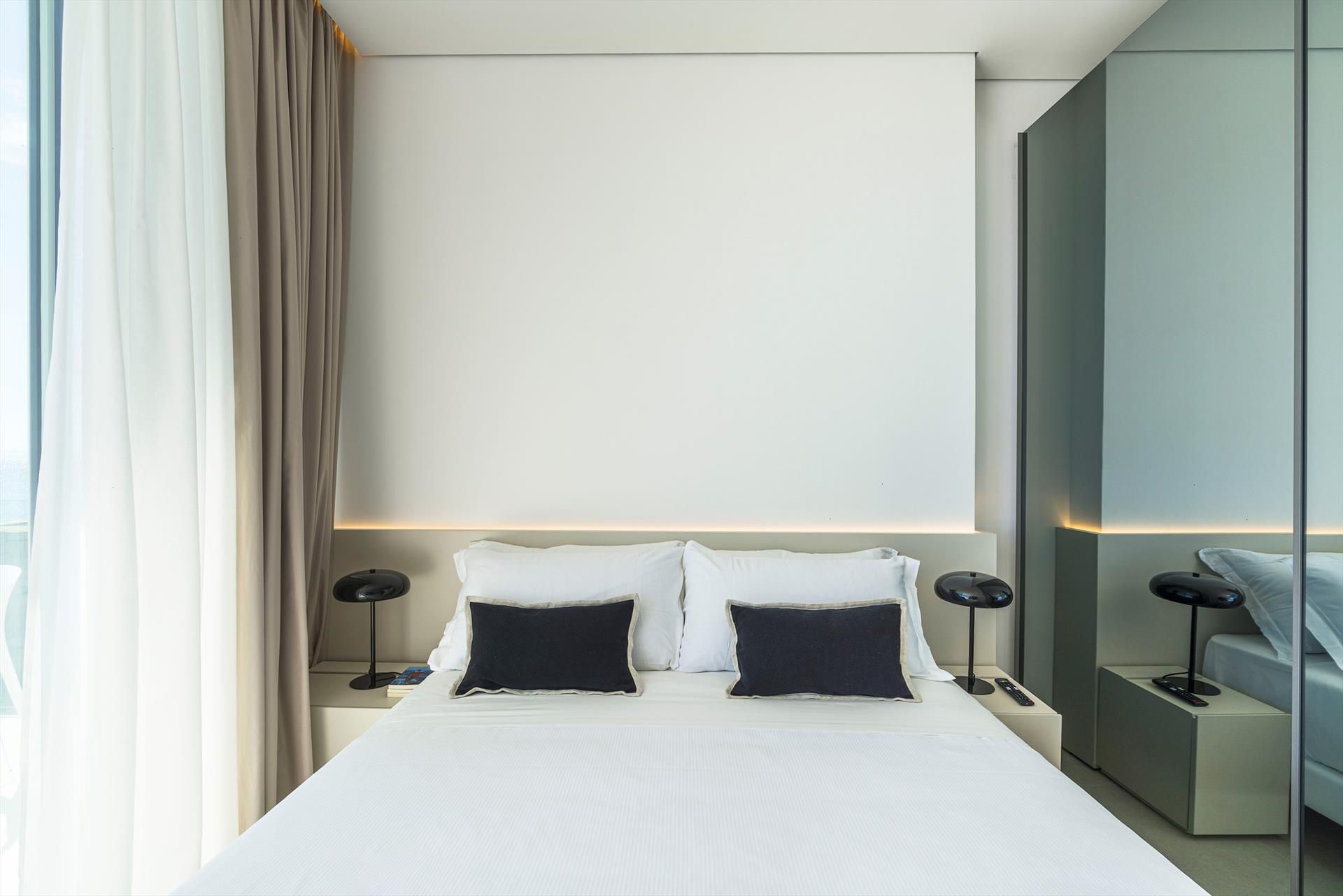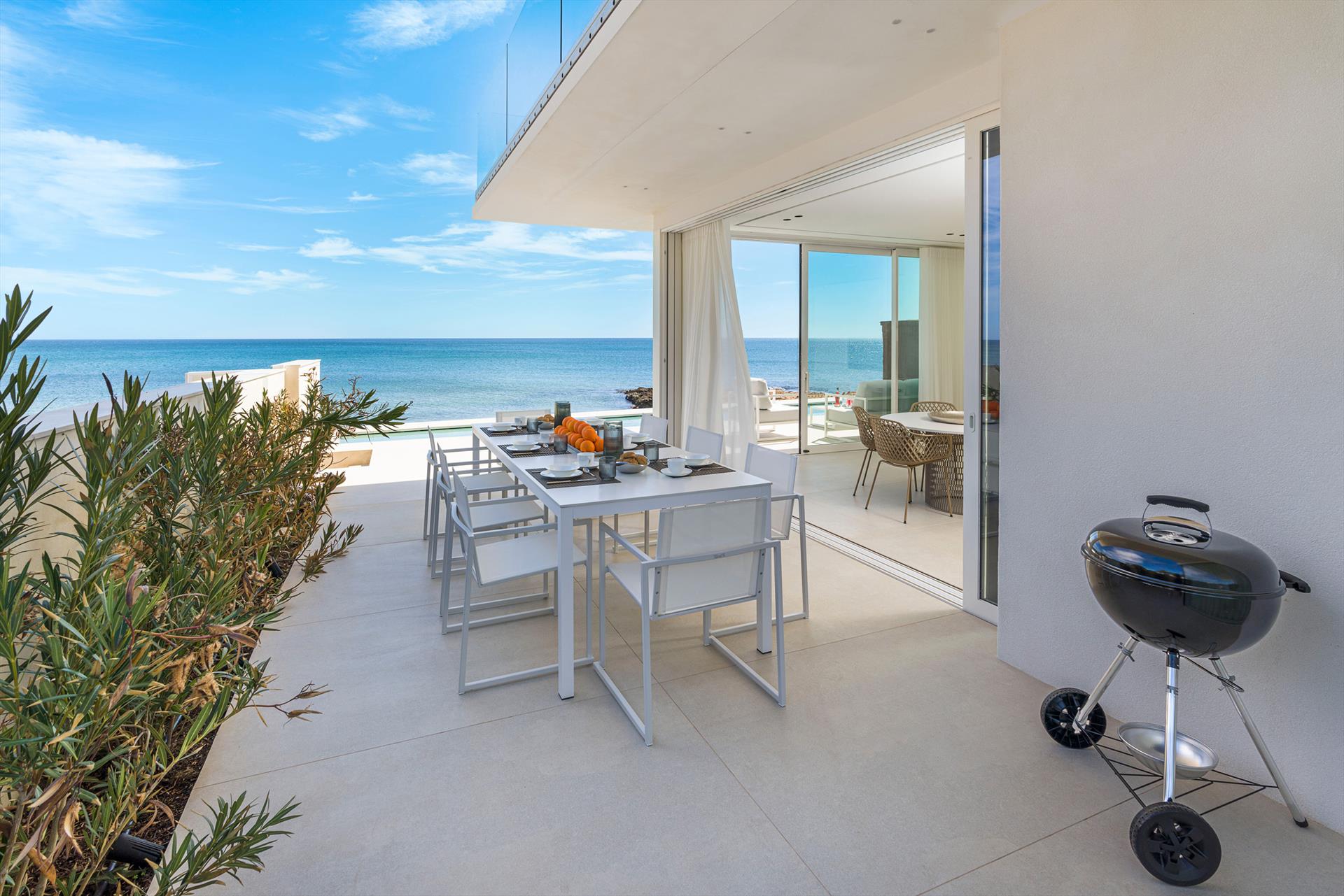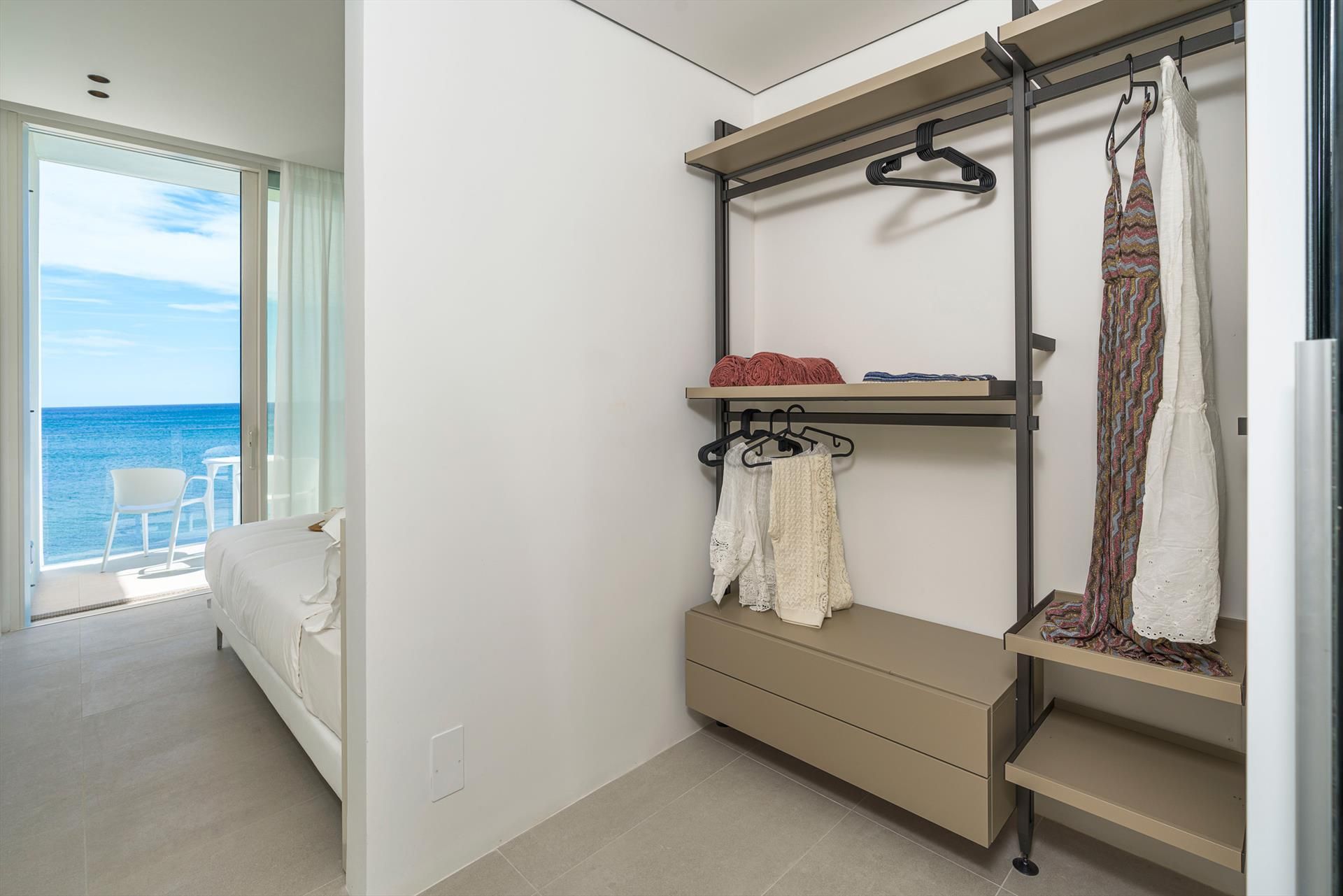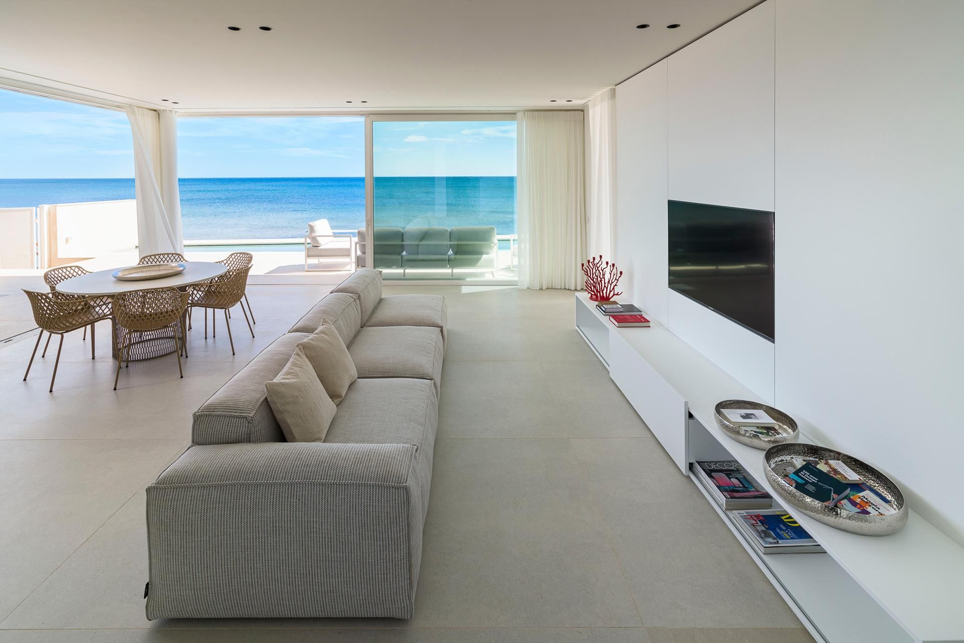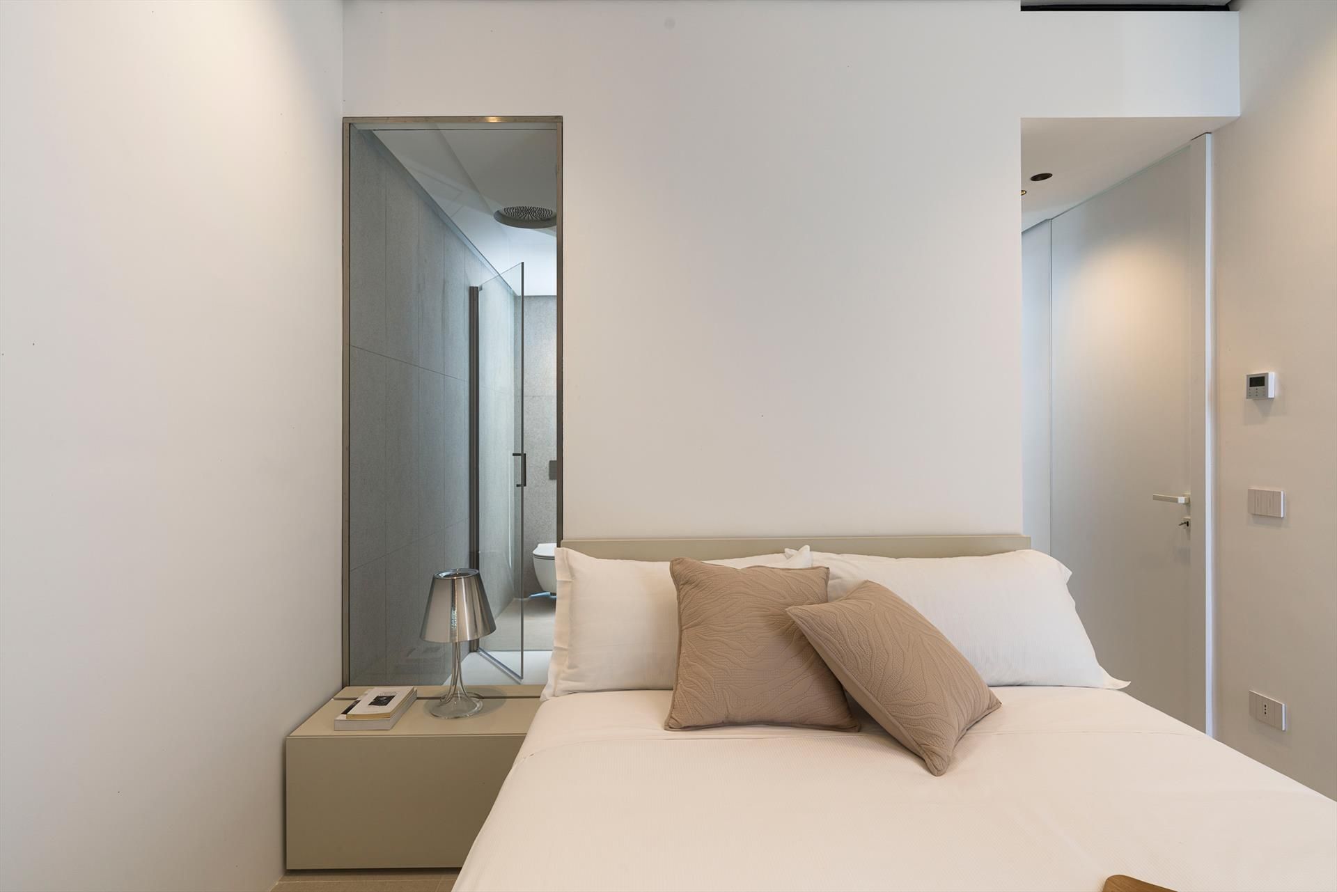 Its comfortable interiors, spread over two levels, have large panoramic windows open onto the sea and include a large living room, a kitchen, four double bedrooms, each with a bathroom with shower, and a terrace facing the sea. The amenities are also top-notch: air conditioning and heating in all rooms, Wi-Fi internet, washer-dryer, dishwasher, Nespresso coffee machine, electric oven and microwave.