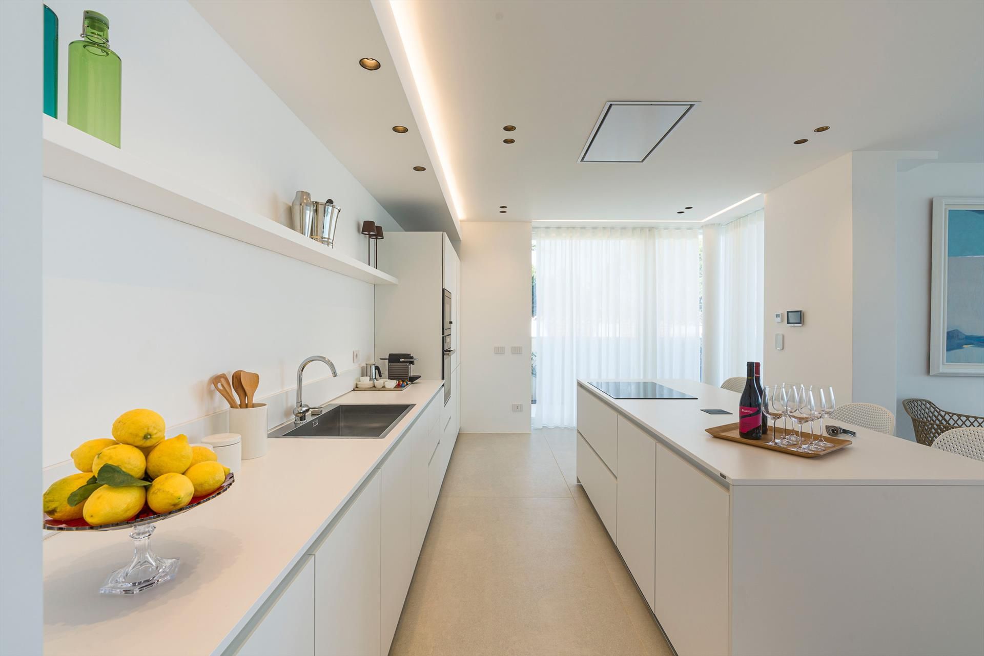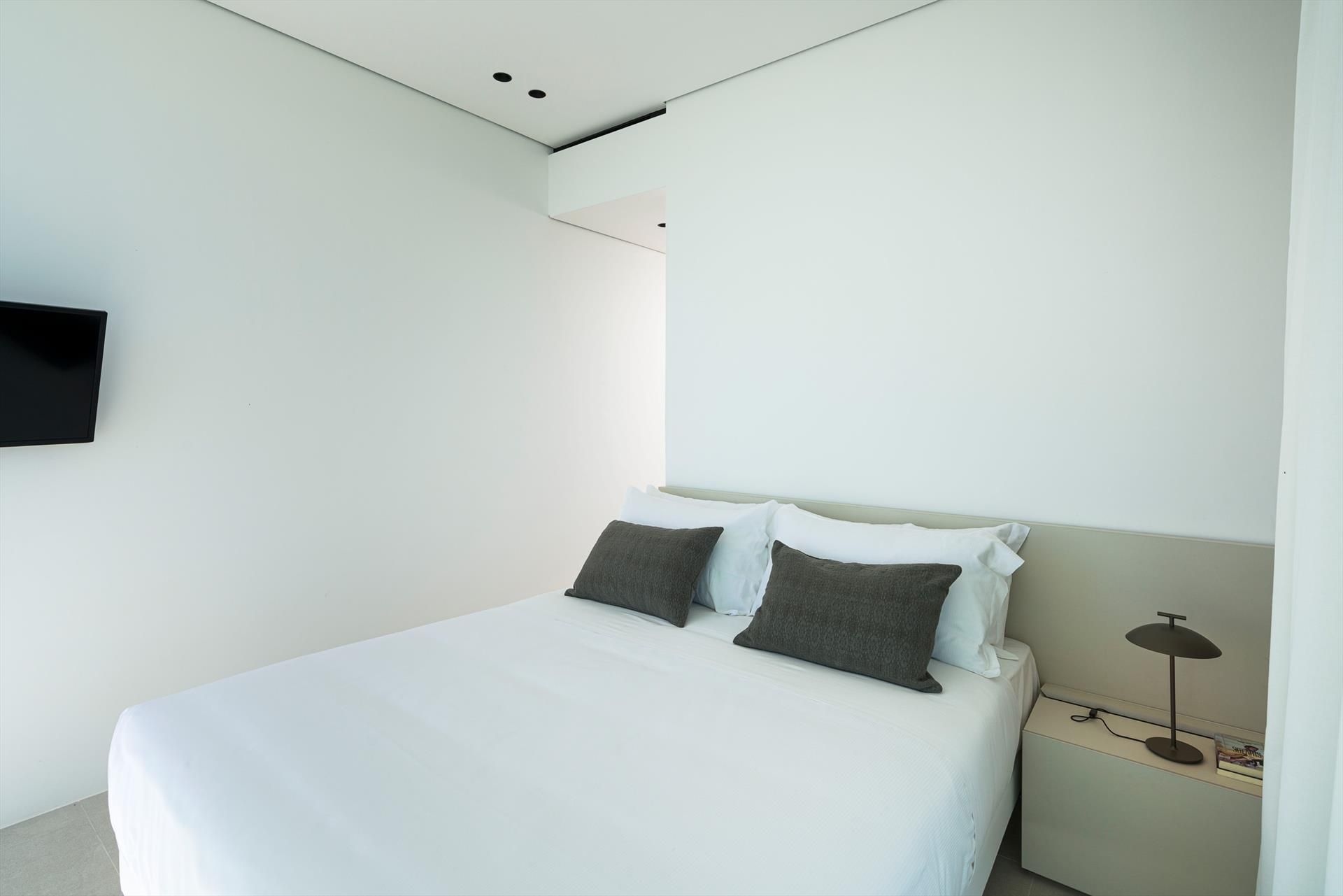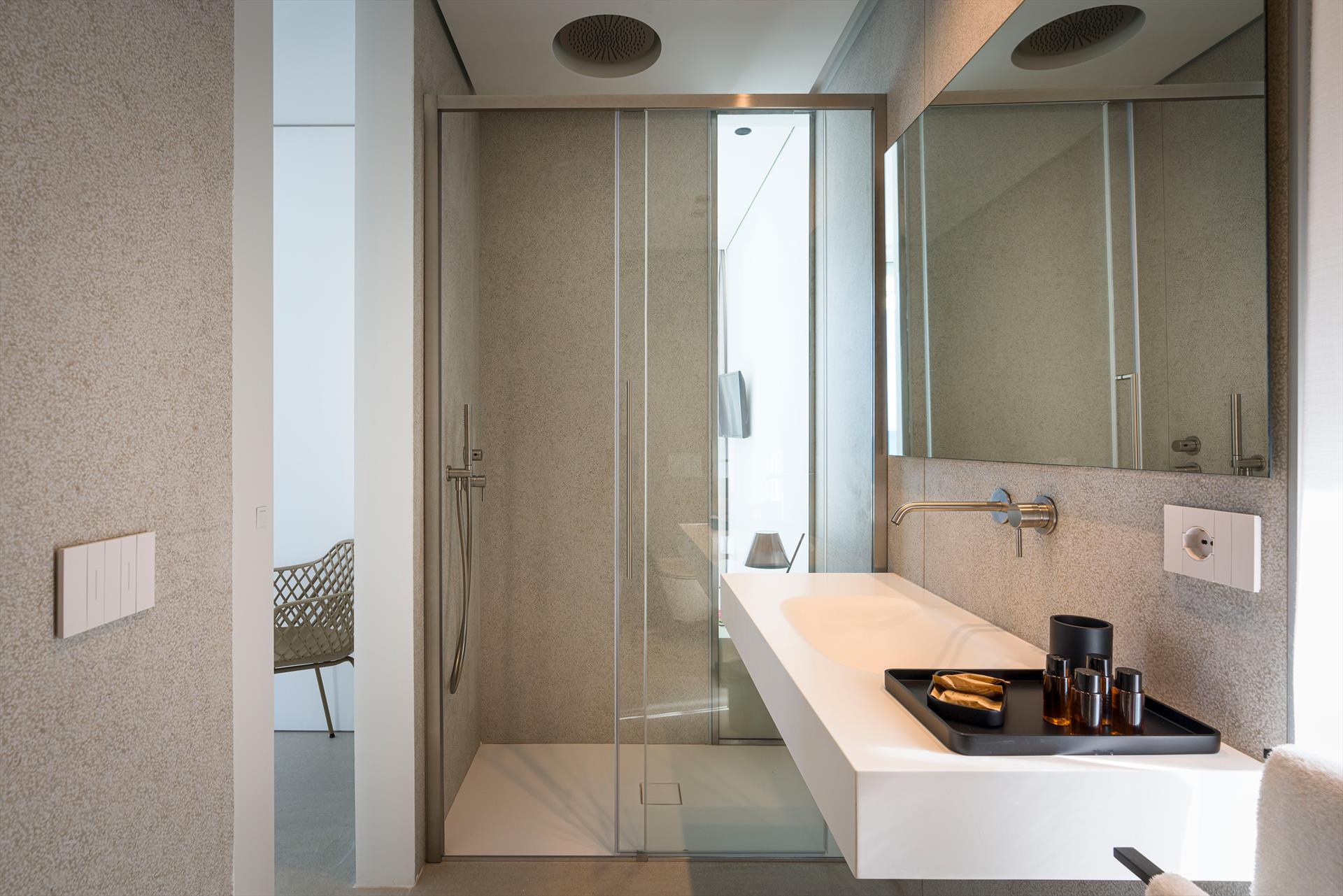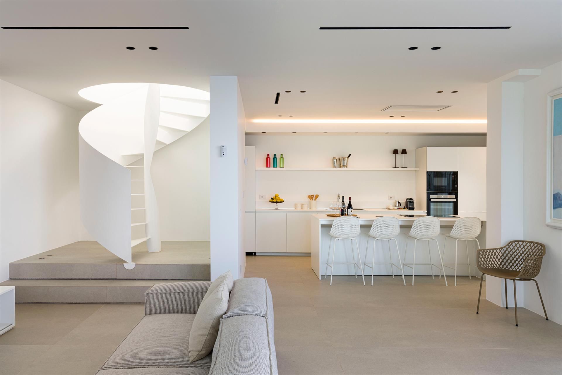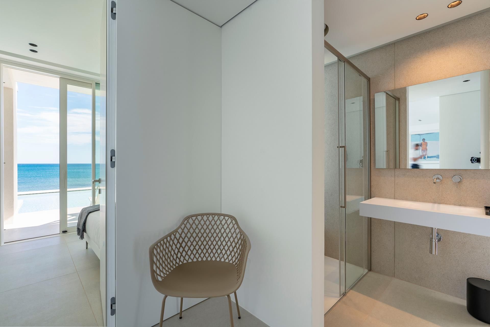 Its comfortable interiors, spread over two levels, have large panoramic windows open onto the sea and include a large living room, a kitchen, four double bedrooms, each with a bathroom with shower, and a terrace facing the sea. The amenities are also top-notch: air conditioning and heating in all rooms, Wi-Fi internet, washer-dryer, dishwasher, Nespresso coffee machine, electric oven and microwave.