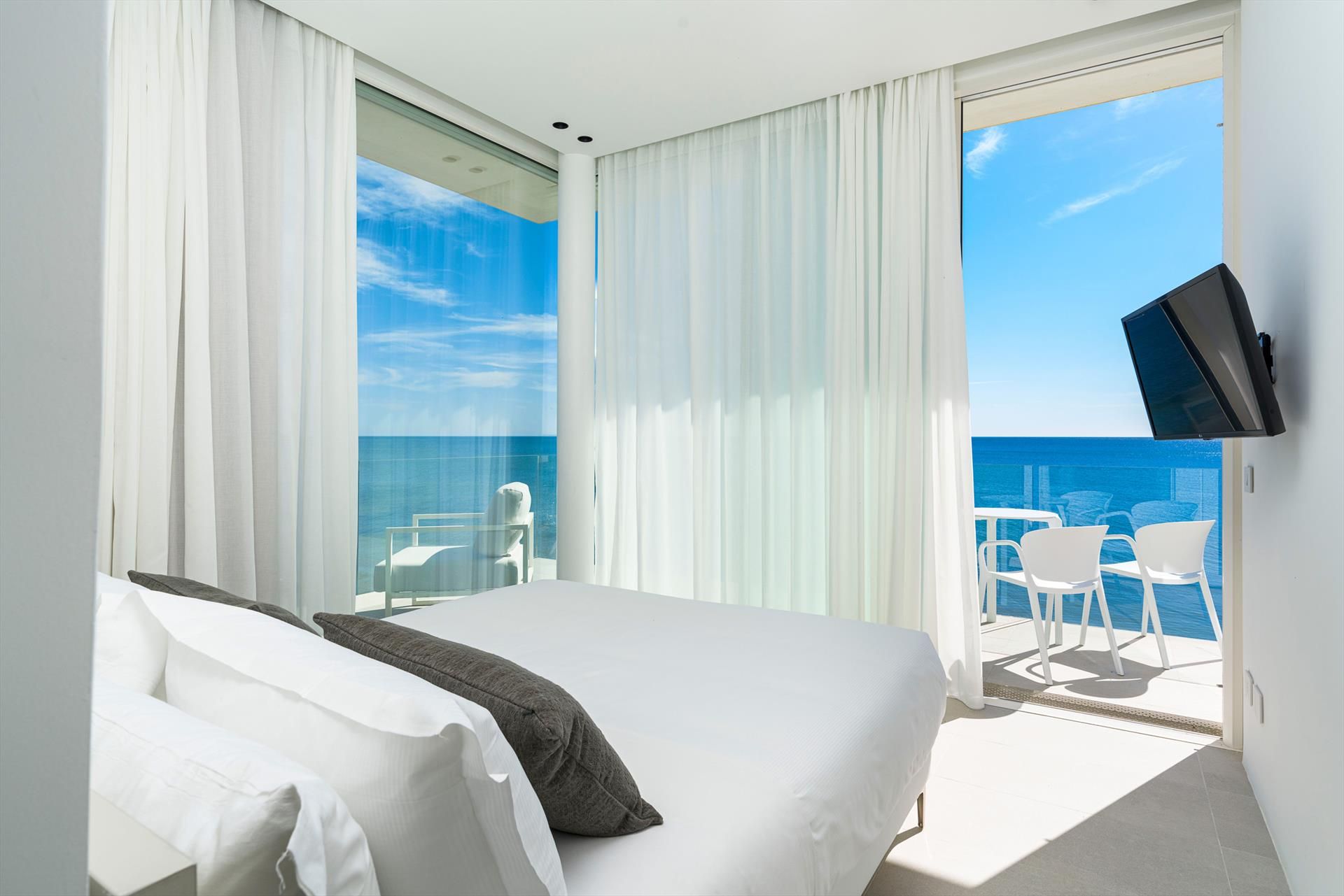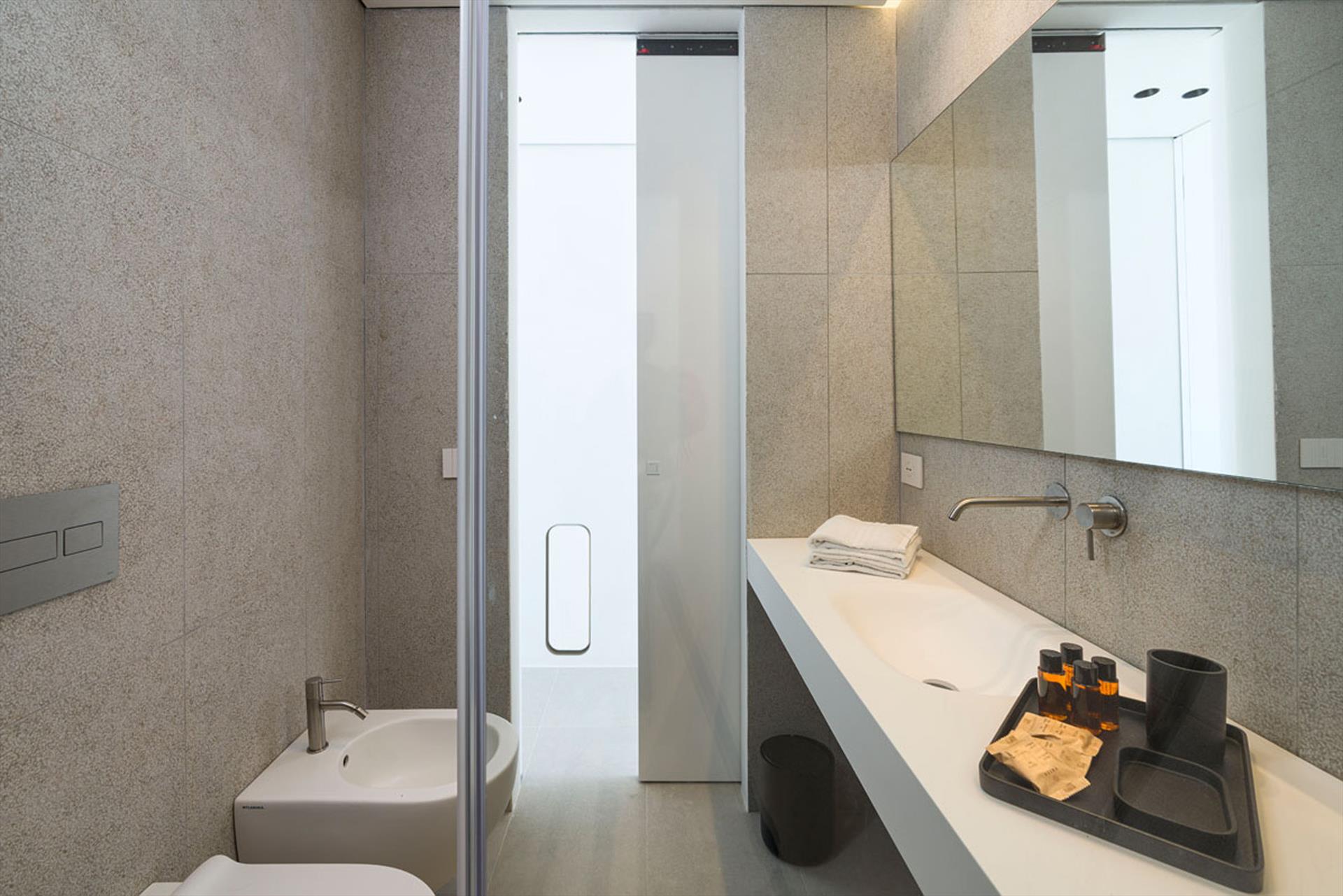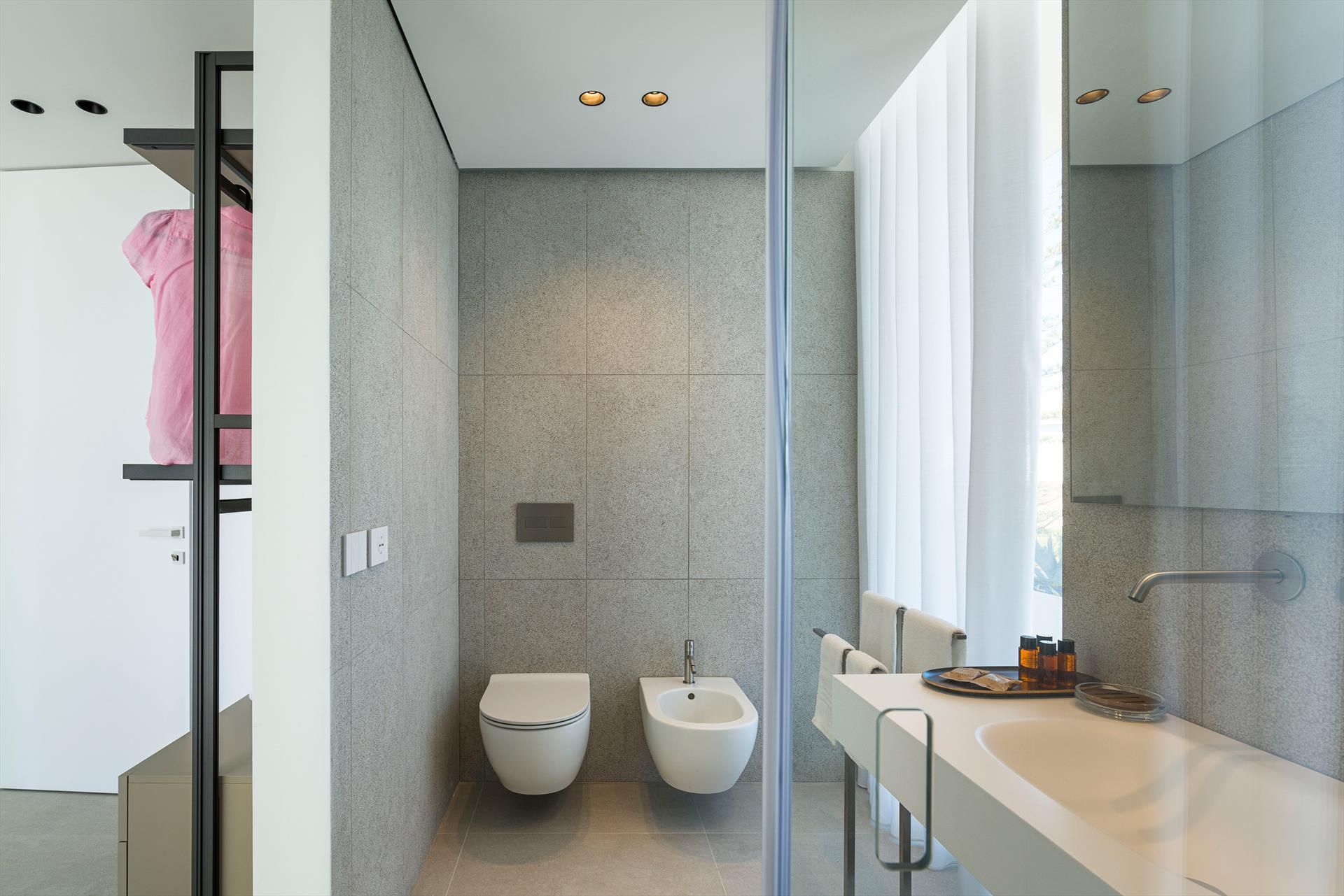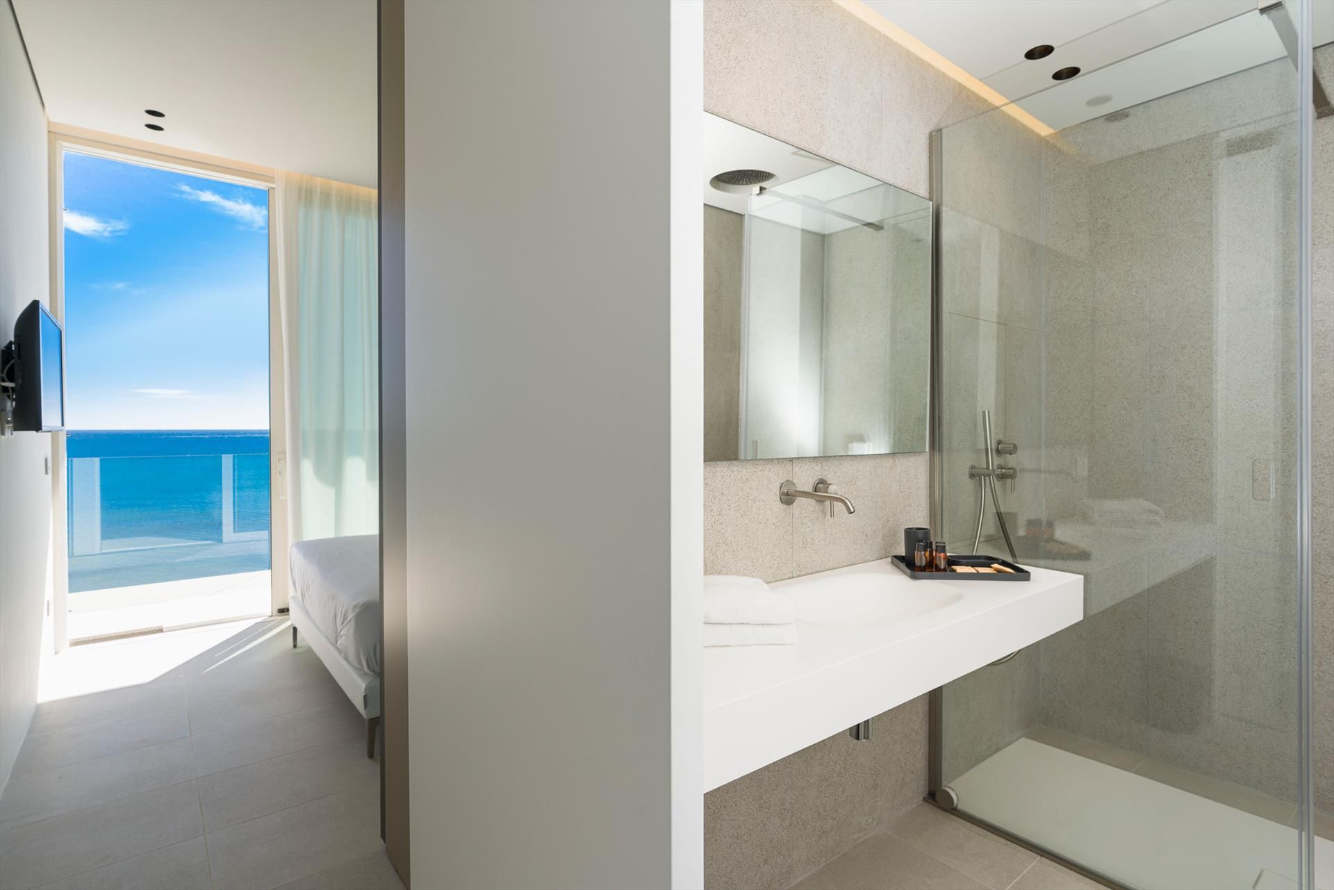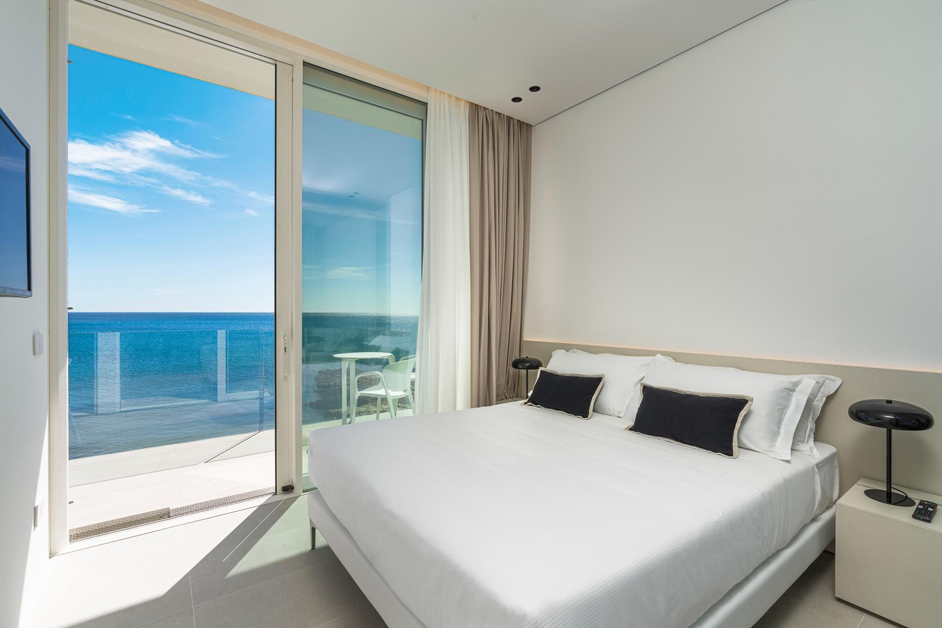 Its comfortable interiors, spread over two levels, have large panoramic windows open onto the sea and include a large living room, a kitchen, four double bedrooms, each with a bathroom with shower, and a terrace facing the sea. The amenities are also top-notch: air conditioning and heating in all rooms, Wi-Fi internet, washer-dryer, dishwasher, Nespresso coffee machine, electric oven and microwave.