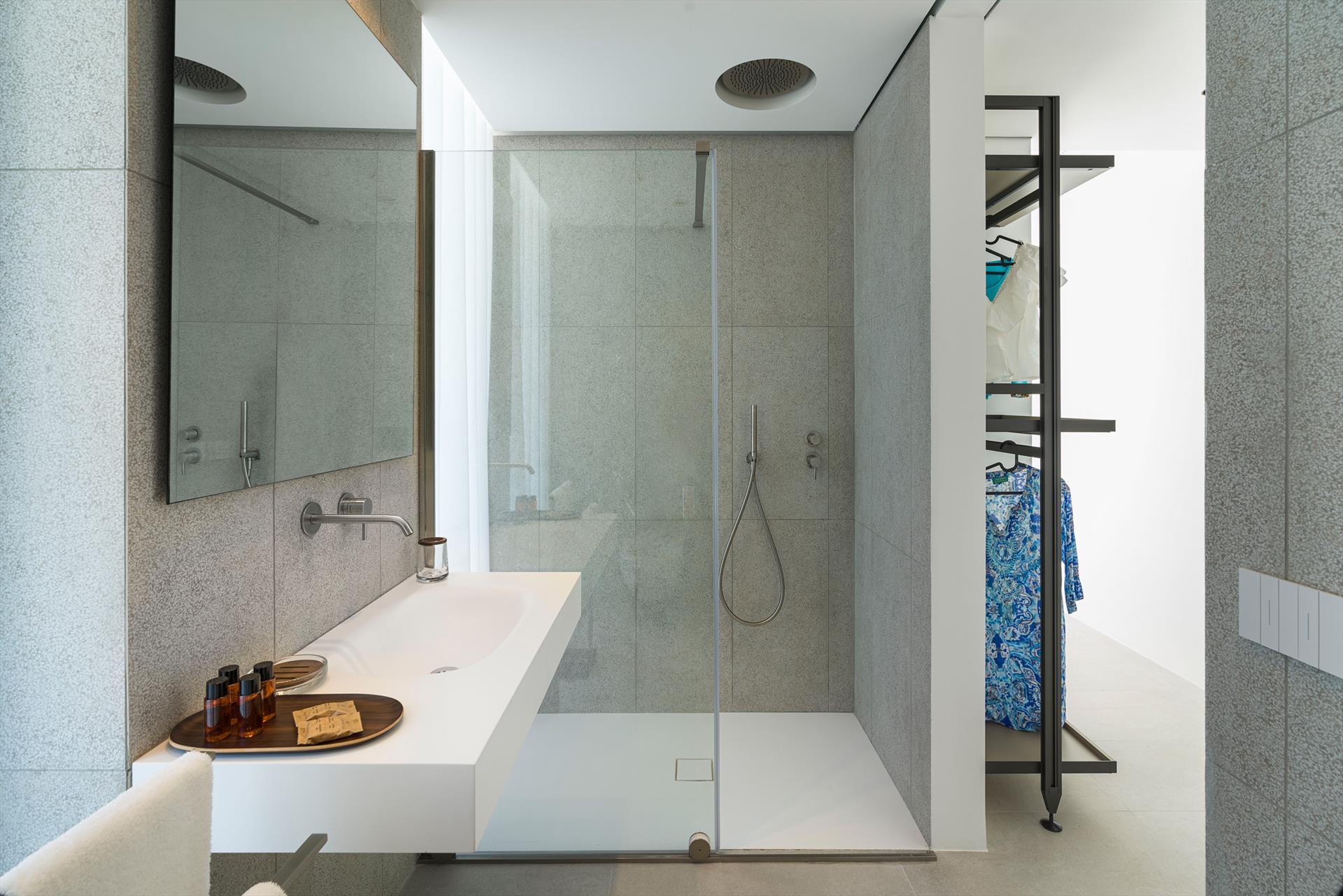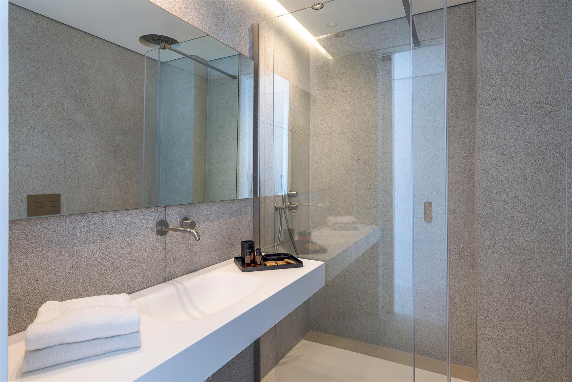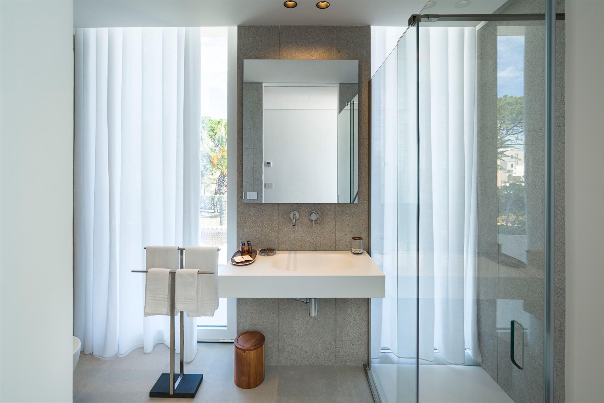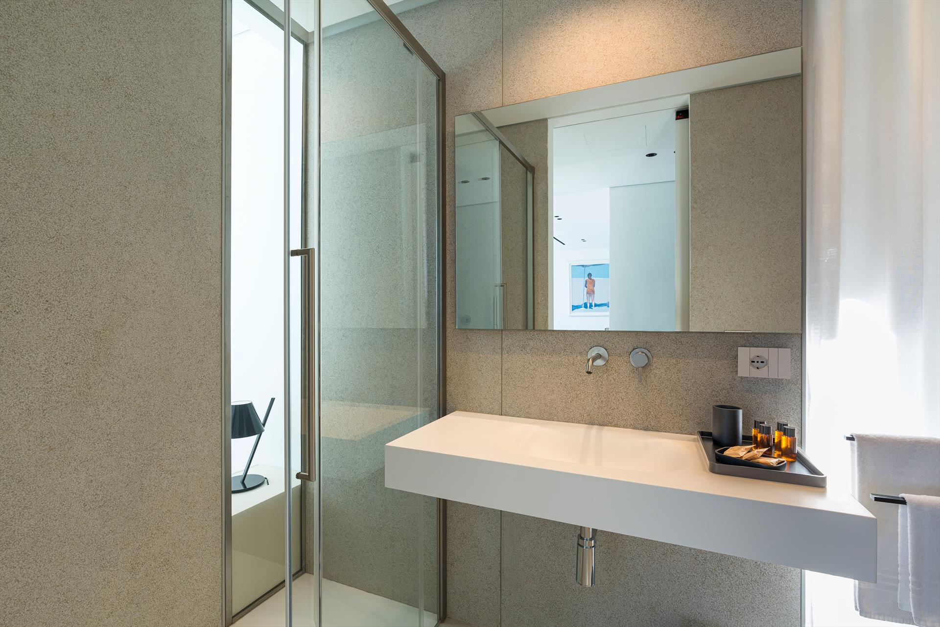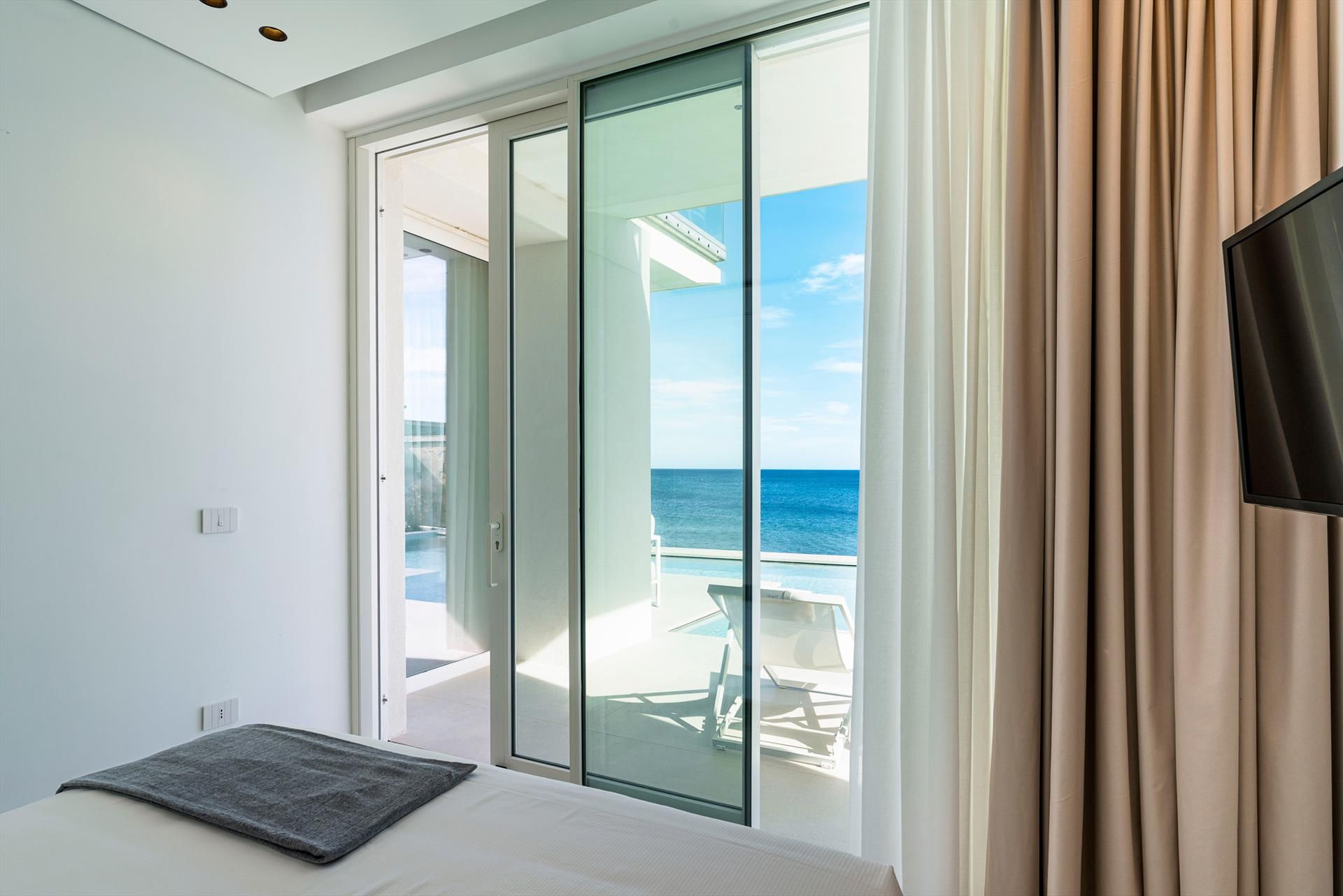 Its comfortable interiors, spread over two levels, have large panoramic windows open onto the sea and include a large living room, a kitchen, four double bedrooms, each with a bathroom with shower, and a terrace facing the sea. The amenities are also top-notch: air conditioning and heating in all rooms, Wi-Fi internet, washer-dryer, dishwasher, Nespresso coffee machine, electric oven and microwave.