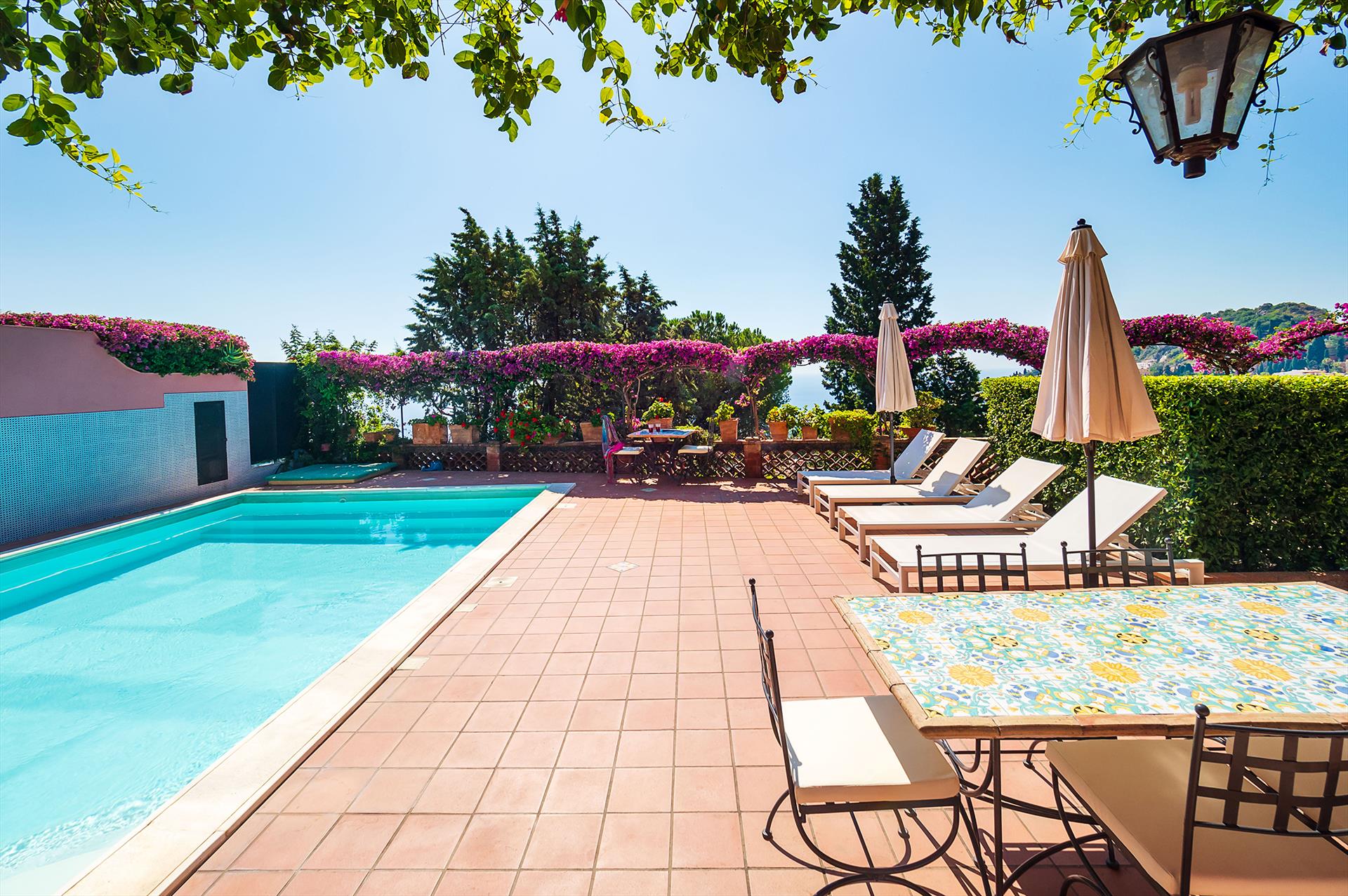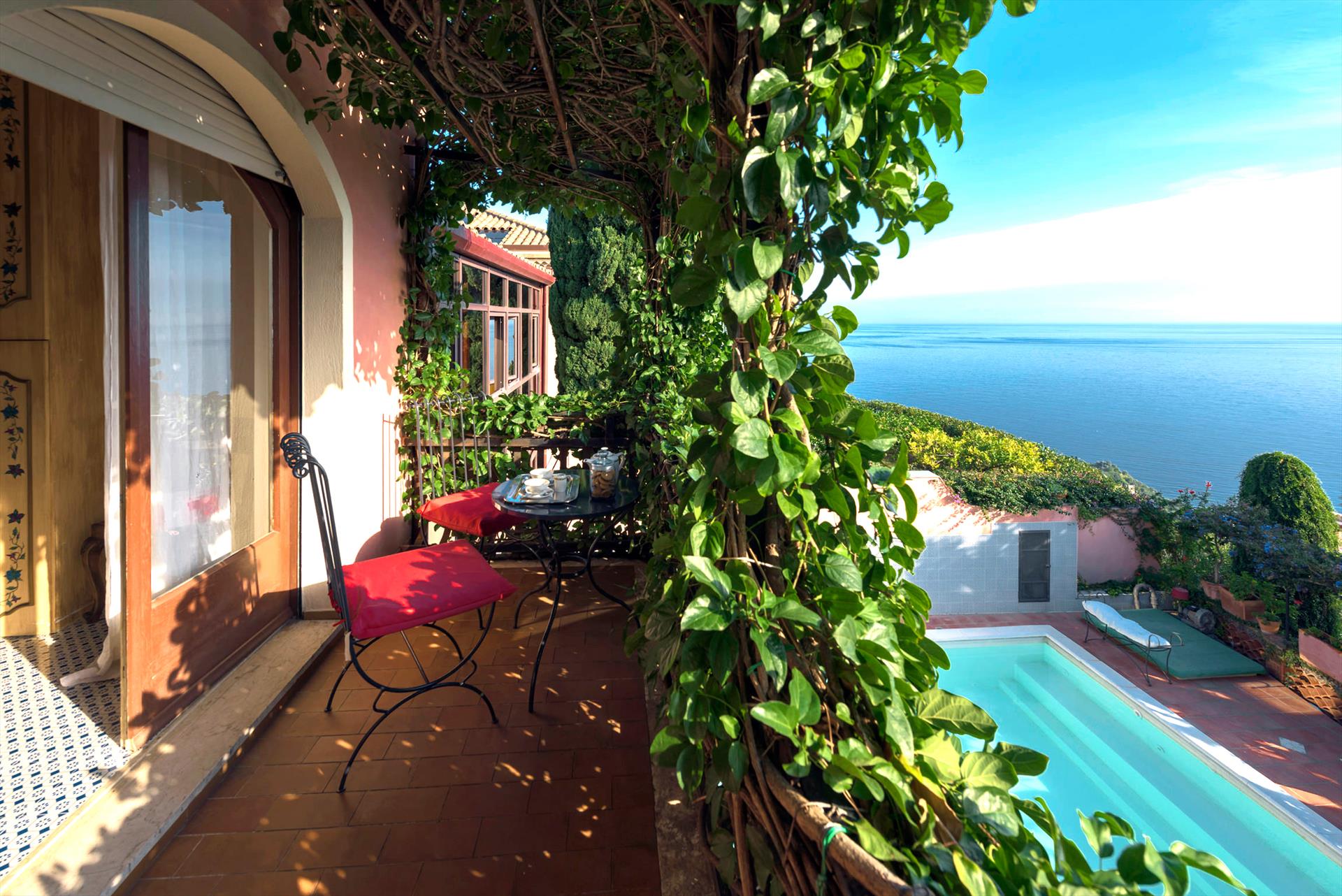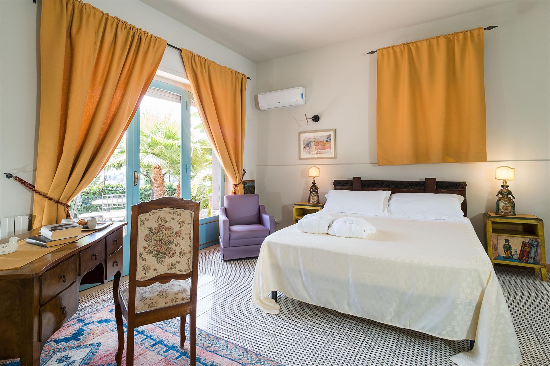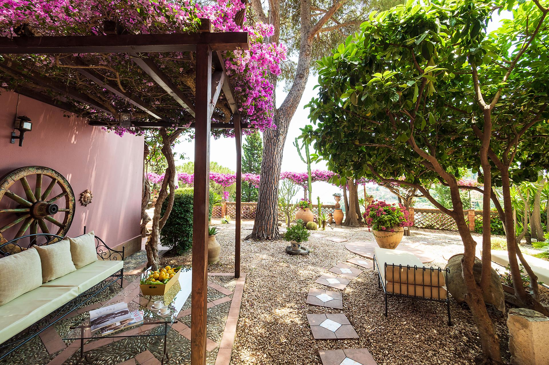 La Boheme is a prestigious villa, with private pool (on request heatable in certain periods) and Mediterranean garden, located in the town of Taormina. The villa is set into sloping ground at the upper end of Taormina and is not far from the popular Corso Umberto with its splendid boutiques, restaurants and cafes, as well as the famous Greek Theatre and other popular sights. La Boheme overlooks the garden and pool area, ideal for spending most hours of the day outside, reading, swimming or 'dining al fresco'. Encompassing 2 floors, La Boheme has been elegantly furnished, featuring beautiful Sicilyn décor, with ancient ceramics and antique furniture. The villa comes with Wi-Fi, washing machine, Sat TV, dishwasher, air conditioning (all rooms) and central heating. Easy to reach by cable car, or a short drive, are the beautiful beaches of Mazzarò and Isola Bella. The city of Catania, the Alcantara Gorges, Mount Etna and the villages of the Cyclops Riviera, can all easily be reached by car.