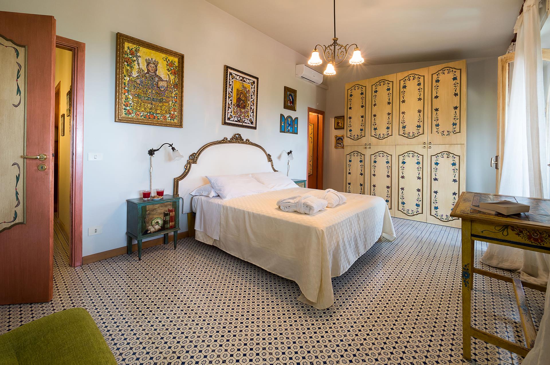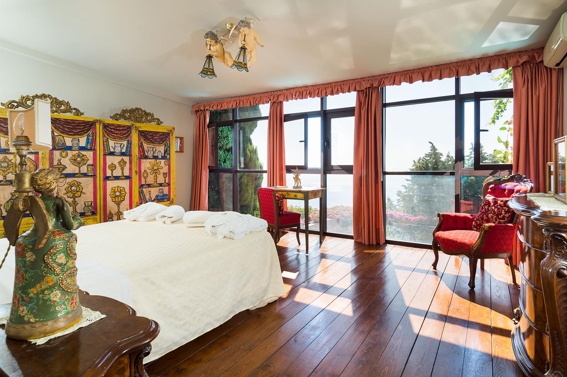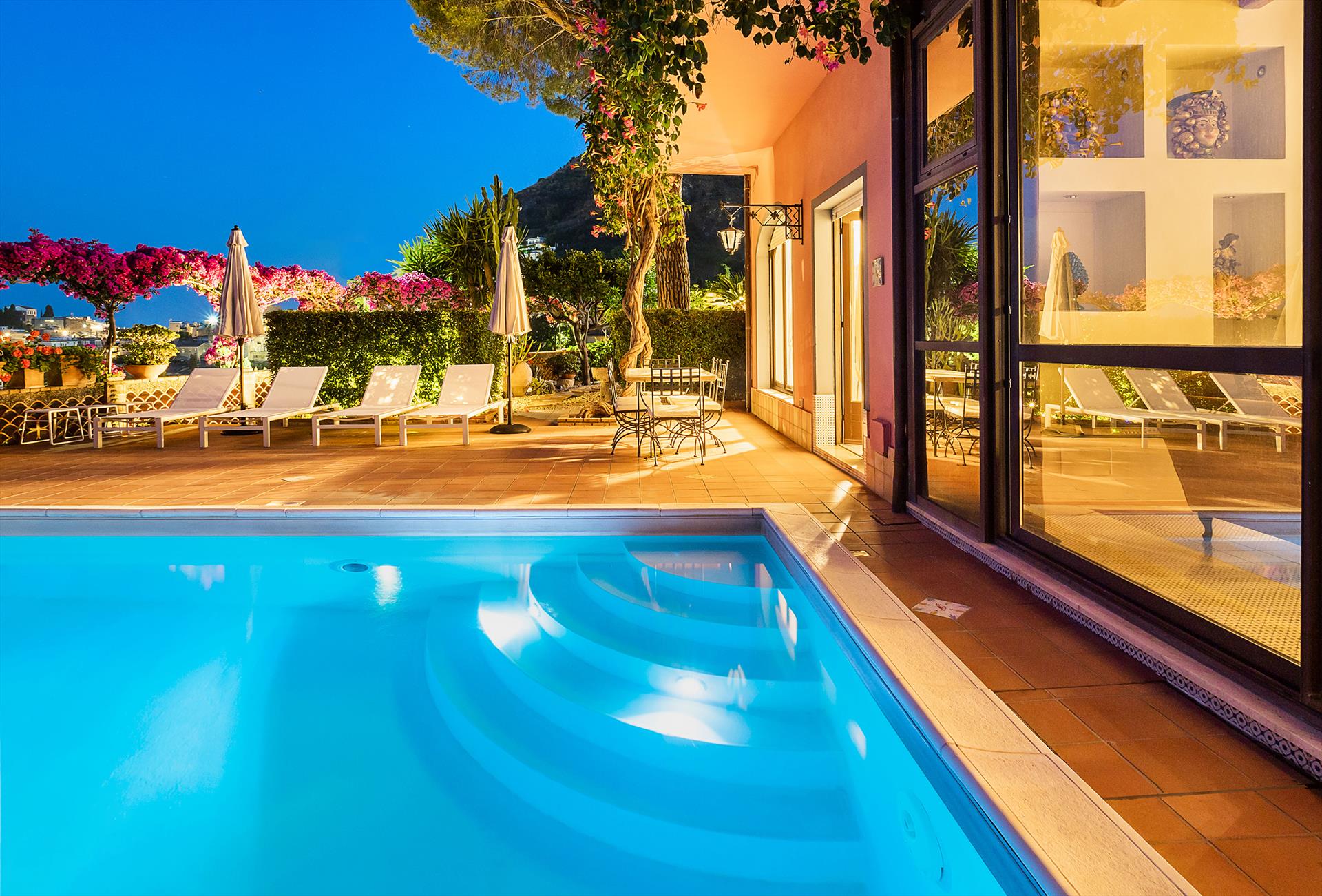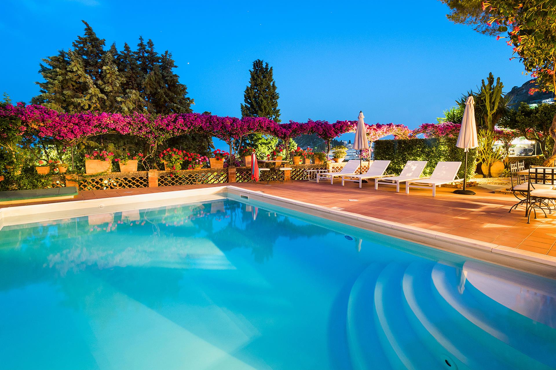 La Boheme is a prestigious villa, with private pool (on request heatable in certain periods) and Mediterranean garden, located in the town of Taormina. The villa is set into sloping ground at the upper end of Taormina and is not far from the popular Corso Umberto with its splendid boutiques, restaurants and cafes, as well as the famous Greek Theatre and other popular sights. La Boheme overlooks the garden and pool area, ideal for spending most hours of the day outside, reading, swimming or 'dining al fresco'. Encompassing 2 floors, La Boheme has been elegantly furnished, featuring beautiful Sicilyn décor, with ancient ceramics and antique furniture. The villa comes with Wi-Fi, washing machine, Sat TV, dishwasher, air conditioning (all rooms) and central heating. Easy to reach by cable car, or a short drive, are the beautiful beaches of Mazzarò and Isola Bella. The city of Catania, the Alcantara Gorges, Mount Etna and the villages of the Cyclops Riviera, can all easily be reached by car.