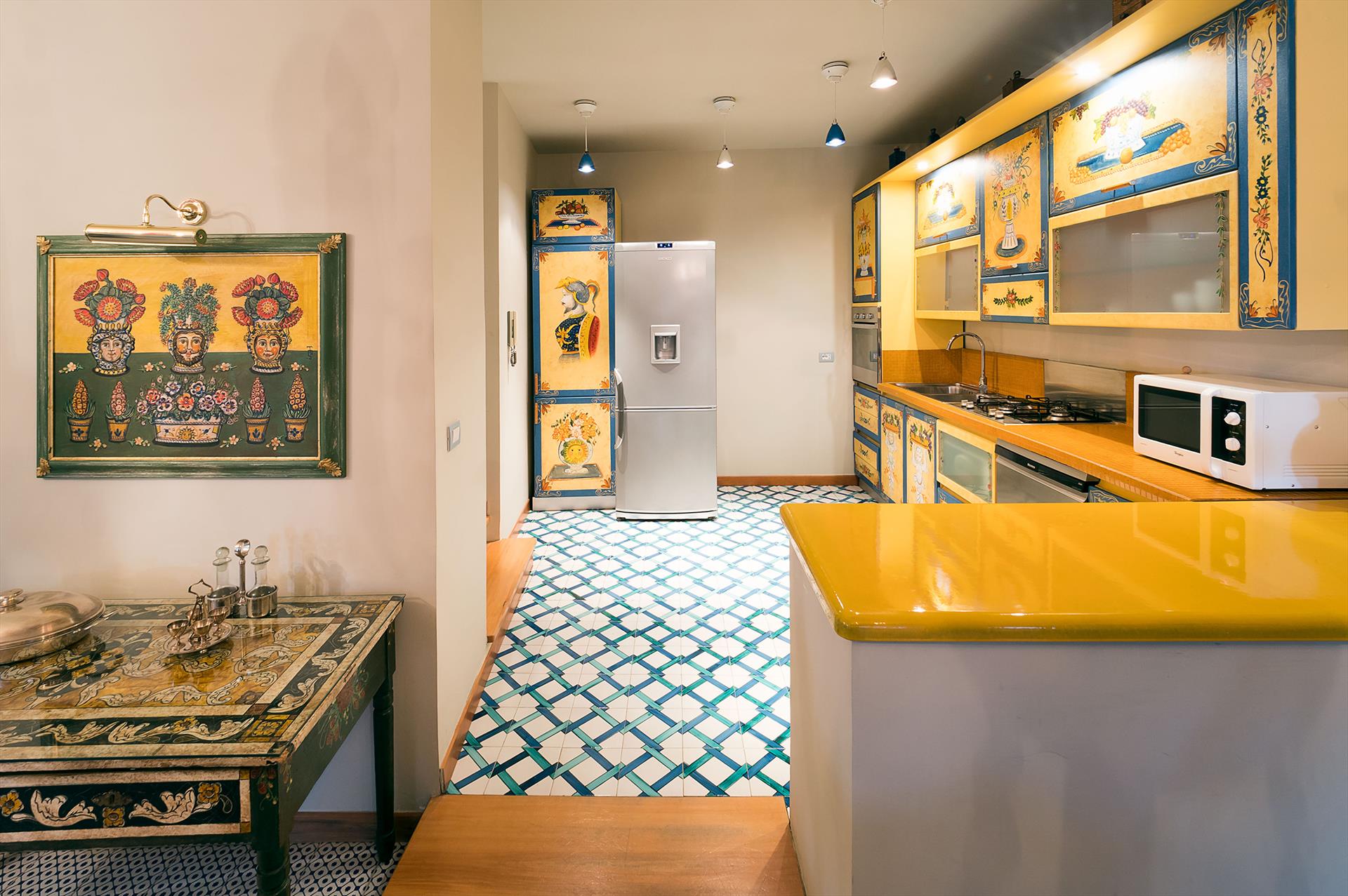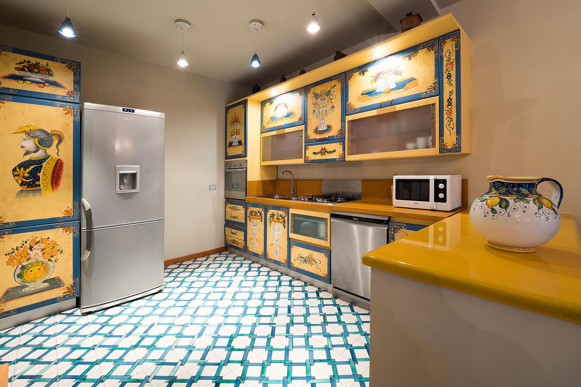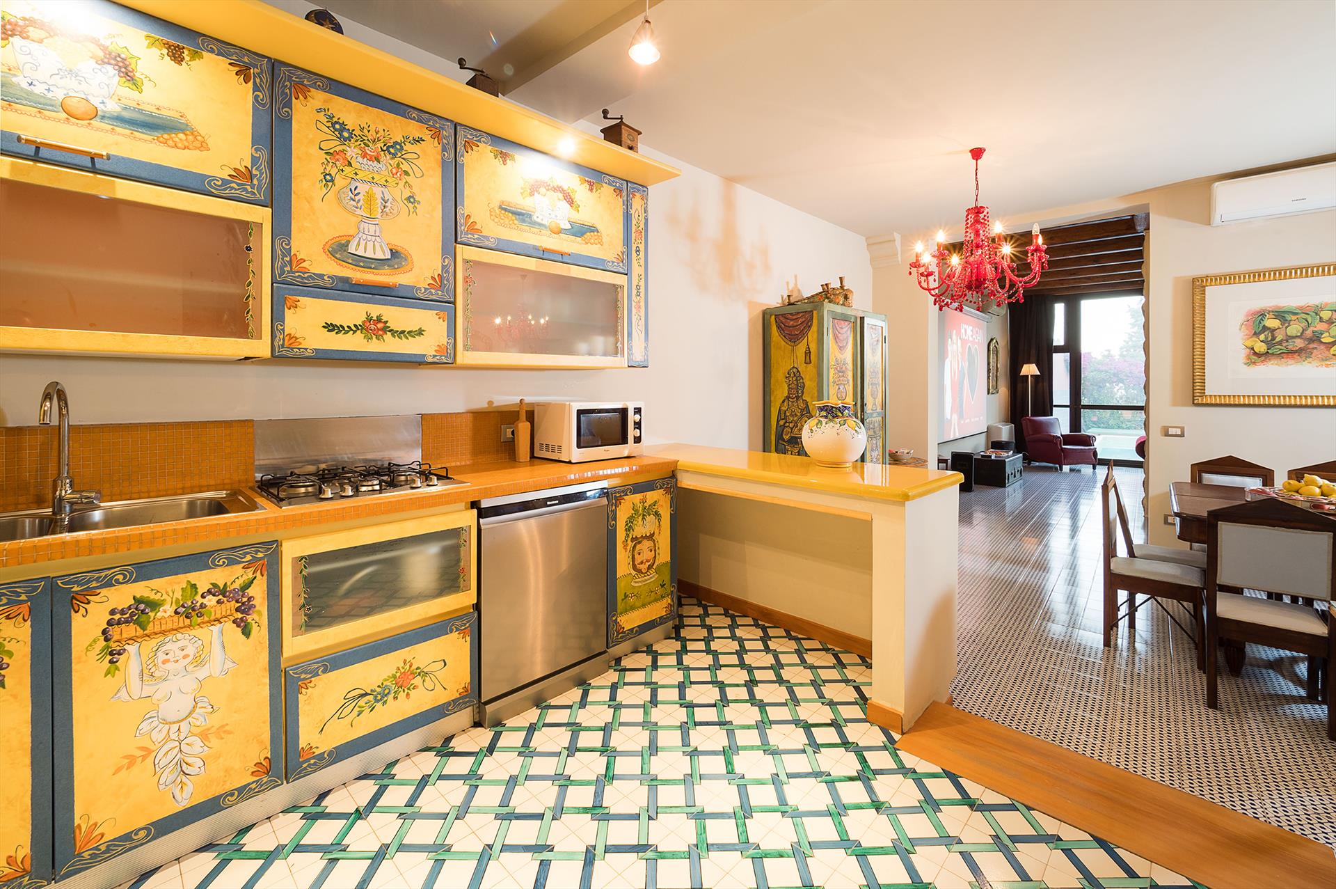 - open kitchen with gas hob, electric oven, microwave, dishwasher, refrigerator, freezer, coffee machine, mixer and toaster