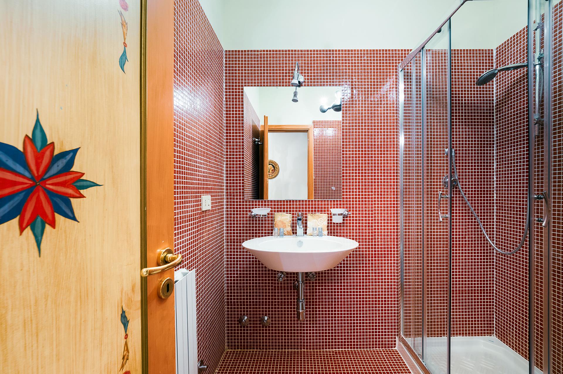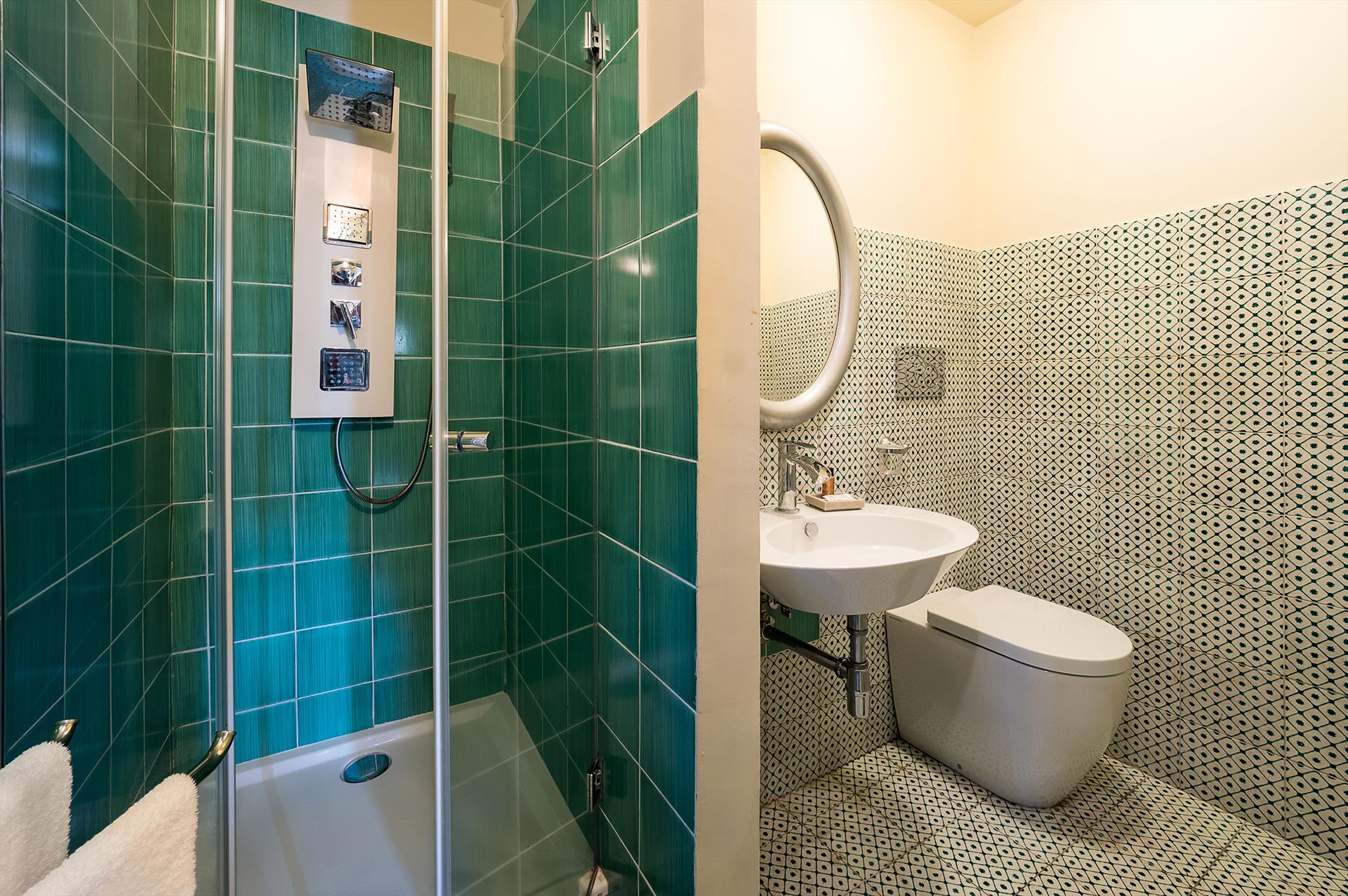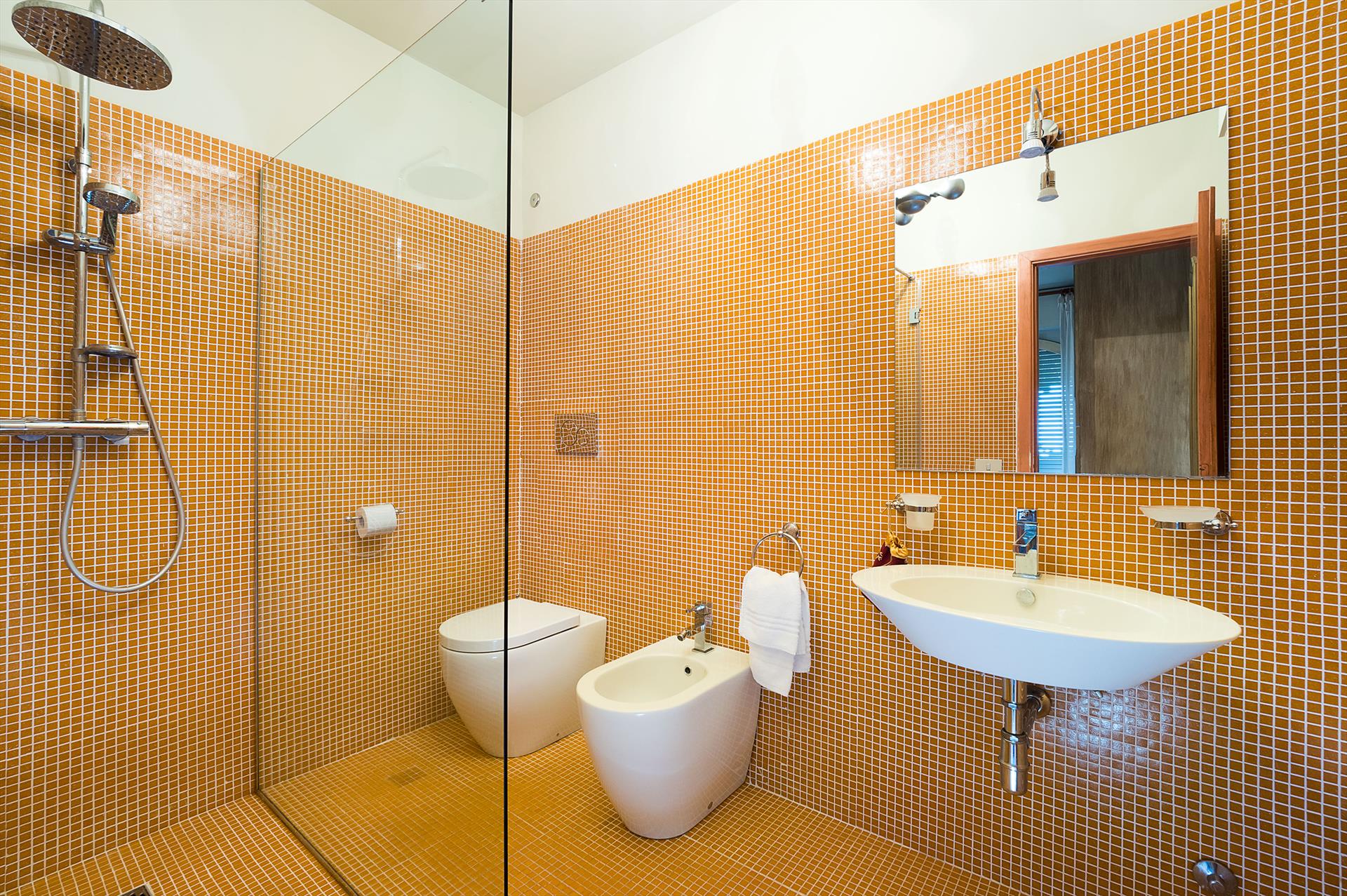 - bathroom with single washbasin, shower, bidet, toilet and hairdryer