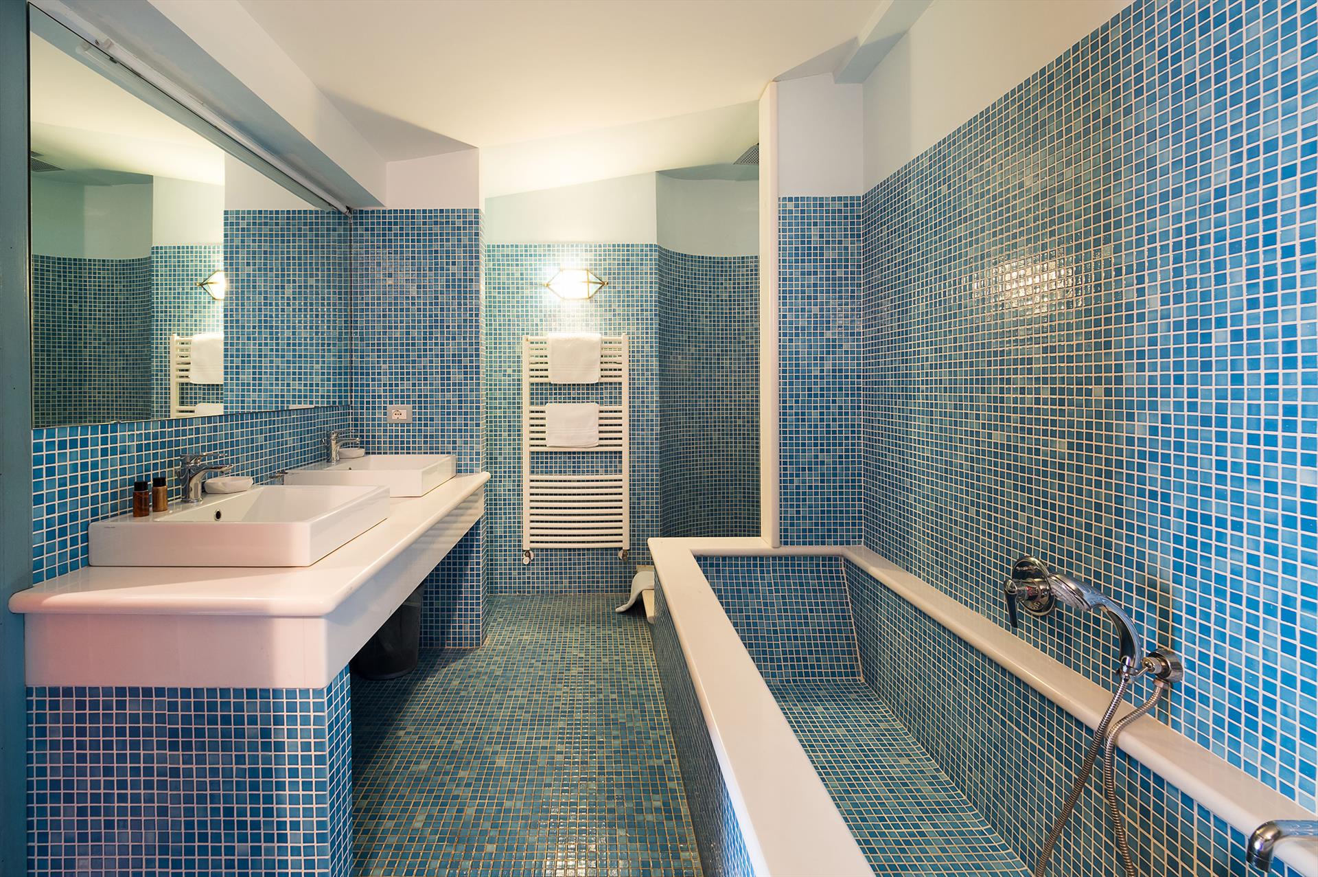 - en-suite bathroom with double washbasin, bath, shower, toilet and hairdryer